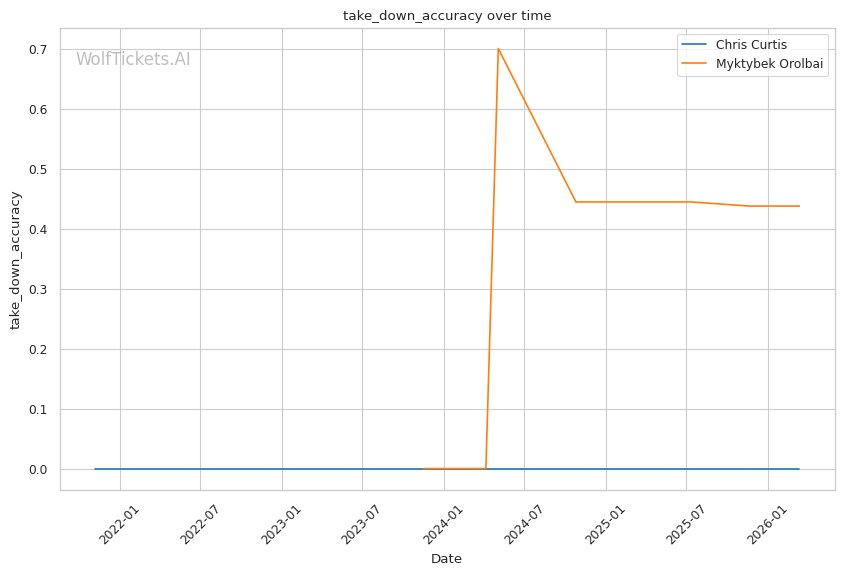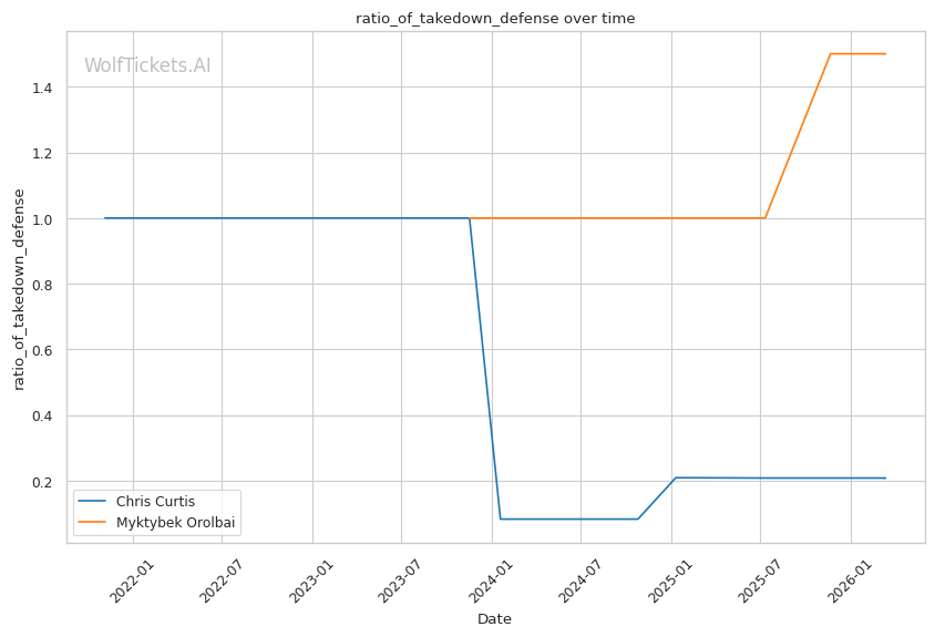 Grappling threat: Orolbai averages 5+ takedowns per fight. Curtis's takedown defense is solid (defended all 20 against Vieira) but his 20.83% takedown defense ratio in the stats suggests vulnerability. If Orolbai mixes wrestling with his pressure, Curtis could find himself in bad positions.