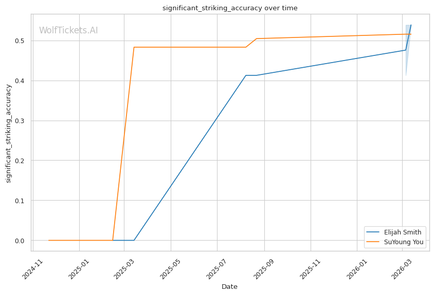 You's clinch striking could punish Smith's first-round defensive lapses. If Smith rushes in looking for takedowns without proper setups, You's knees and elbows in the clinch could accumulate damage quickly.