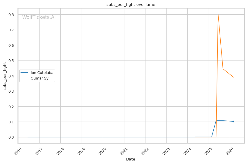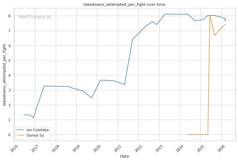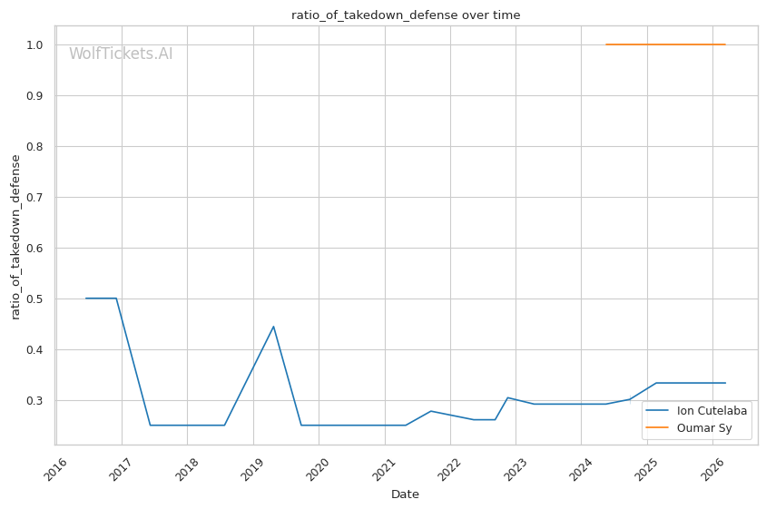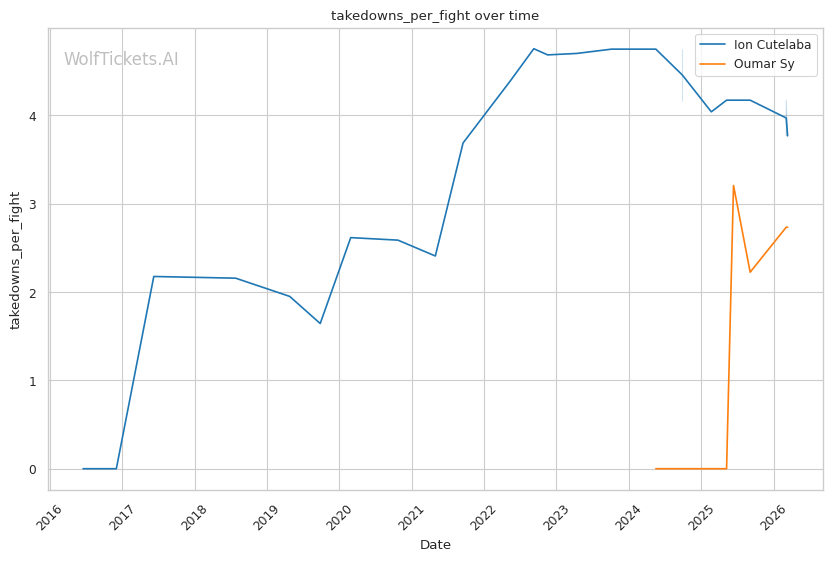 Sy's perfect takedown defense ratio (1.0) contrasts with Cutelaba's reliance on wrestling. If Sy can stuff takedowns and keep the fight standing, his length becomes decisive.