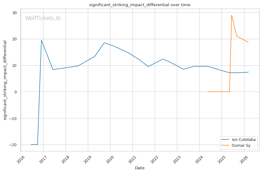Striking Impact Differential and Significant Striking Impact Differential both increased the score by 1.0 each, favoring Sy's ability to land meaningful strikes while absorbing less damage.