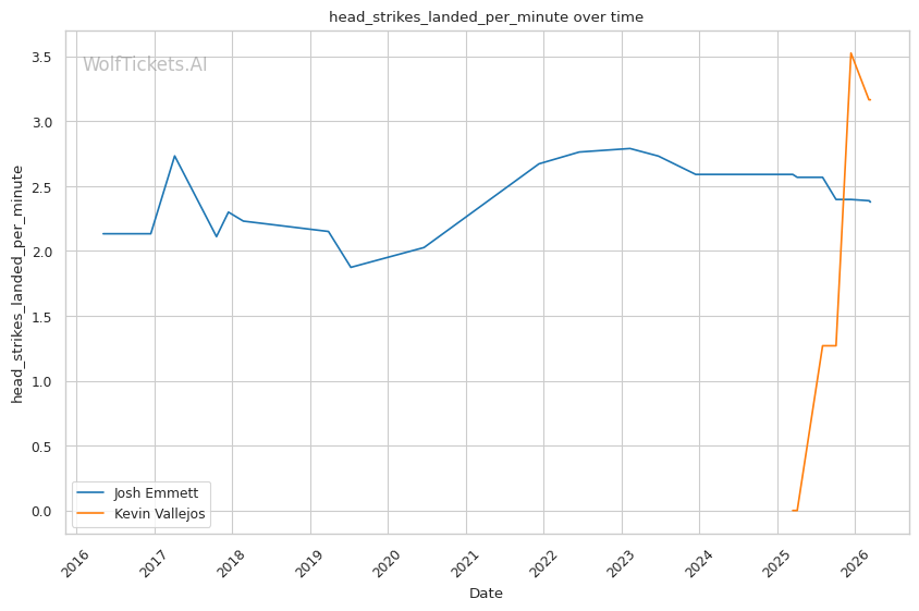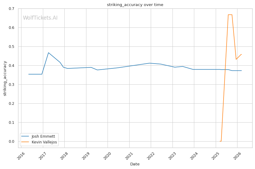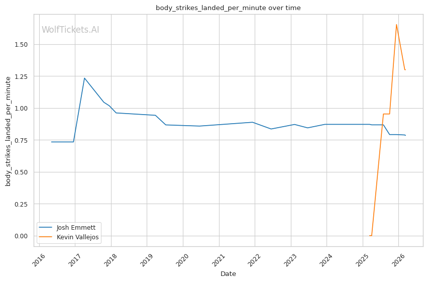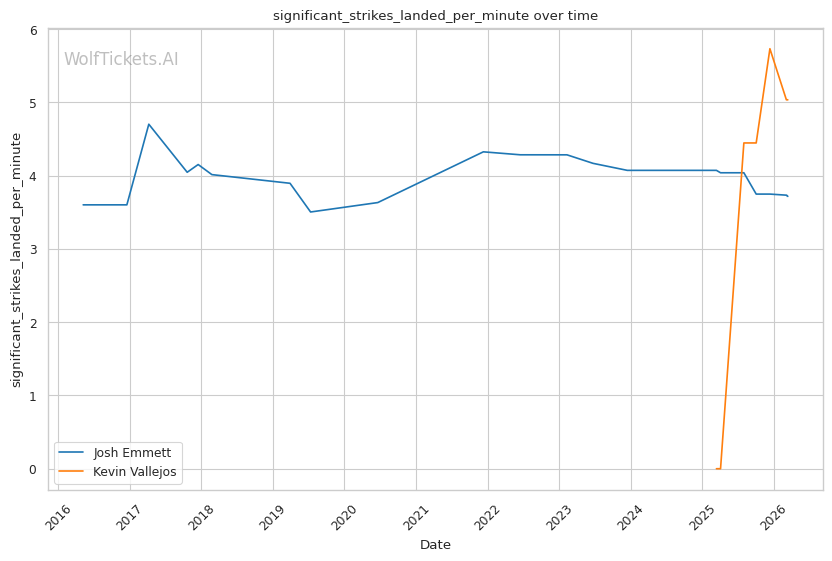 Vallejos lands 5.03 significant strikes per minute compared to Emmett's 3.72. His volume advantage should establish early dominance. Emmett's best chance is landing a big shot in the opening exchanges before Vallejos can time his entries. However, Vallejos has shown he can weather early storms. Against Chikadze, he was stunned in round one but recovered by clinching.