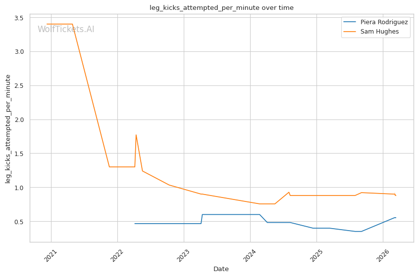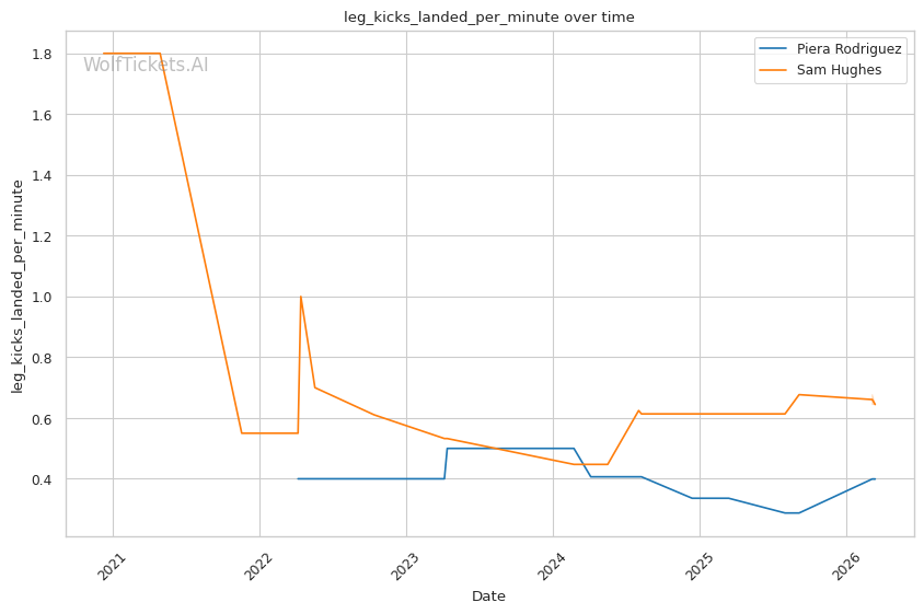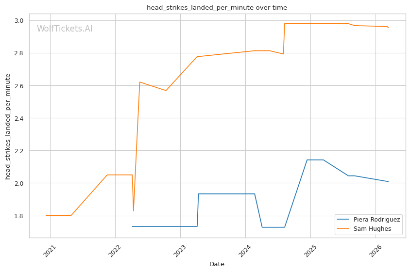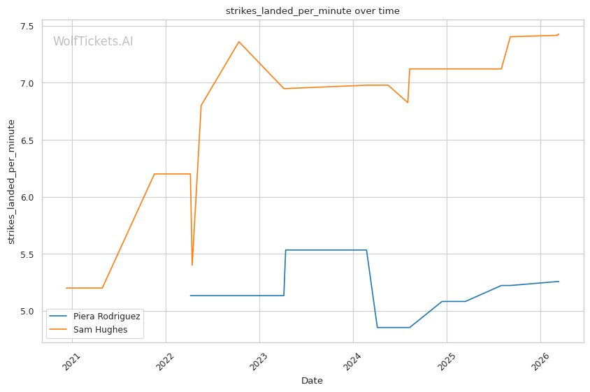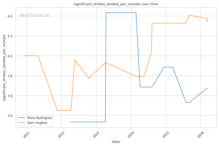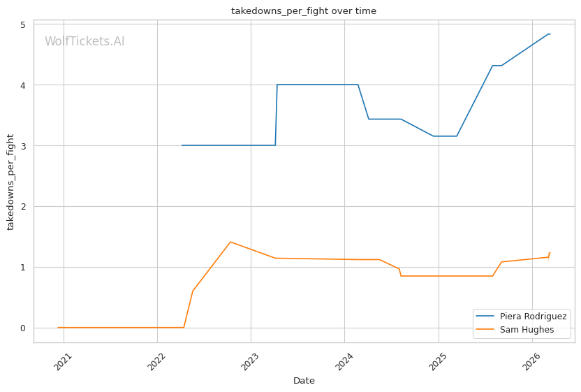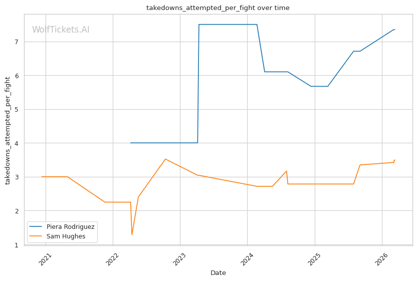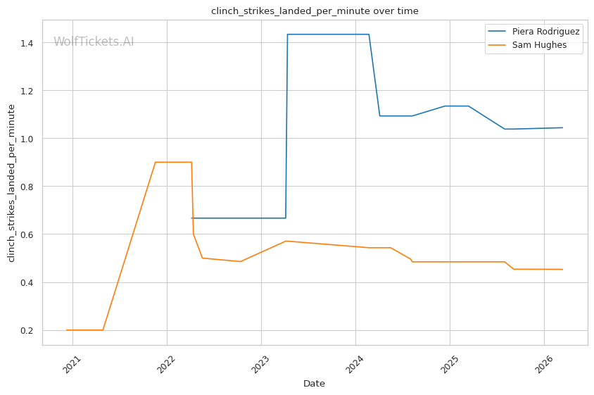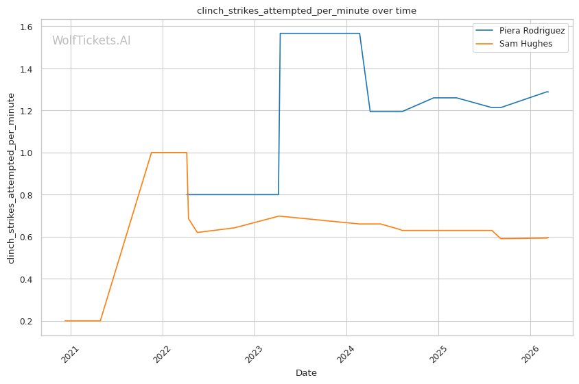 Rodriguez averages 4.83 takedowns per fight with 65.8% accuracy. Her grappling volume creates constant problems for opponents who want to keep the fight standing. Against Hughes in their first meeting, Rodriguez's relentless pressure and clinch work controlled the pace across three rounds, earning a clear unanimous decision.