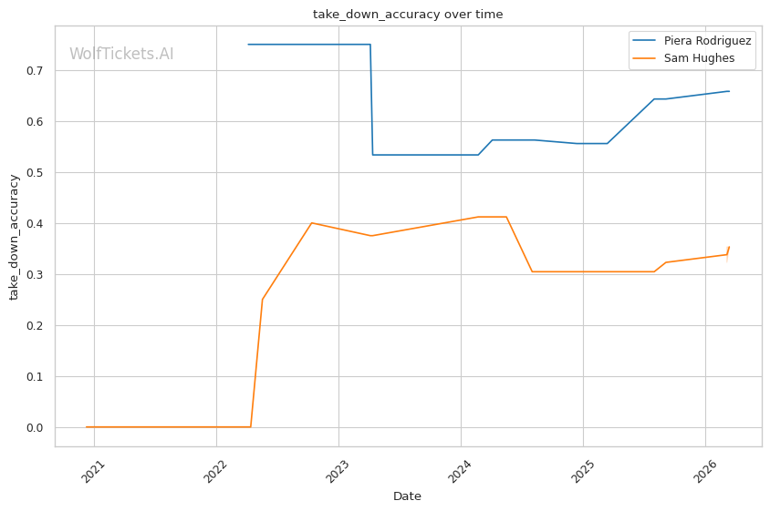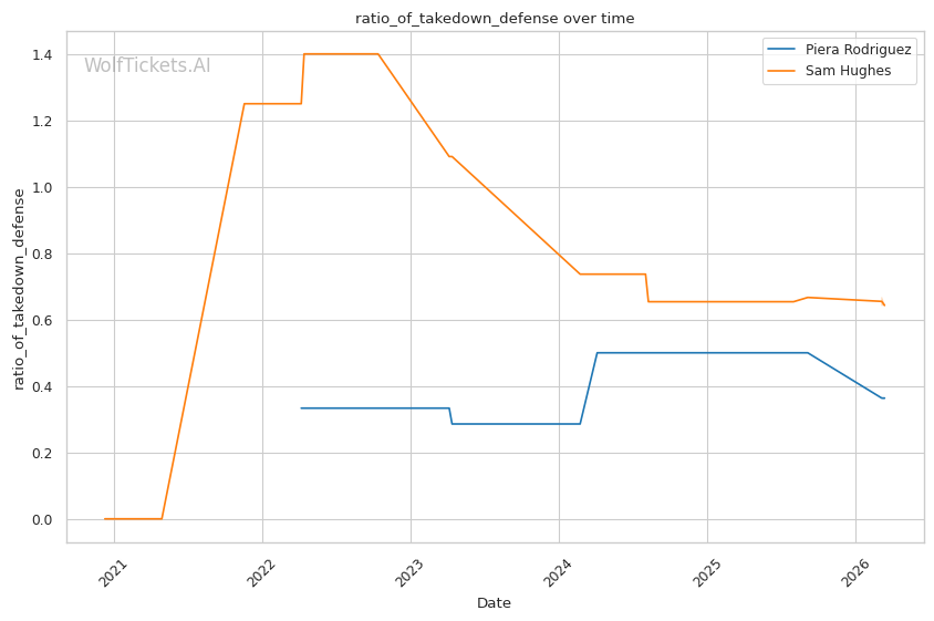 Hughes's improved grappling could be a factor if she can establish top position. Her stack passing and positional advancement showed against Bannon could cause problems if Rodriguez ends up on her back. However, Rodriguez's takedown defense (50% in recent fights) and scrambling ability make this a difficult path.