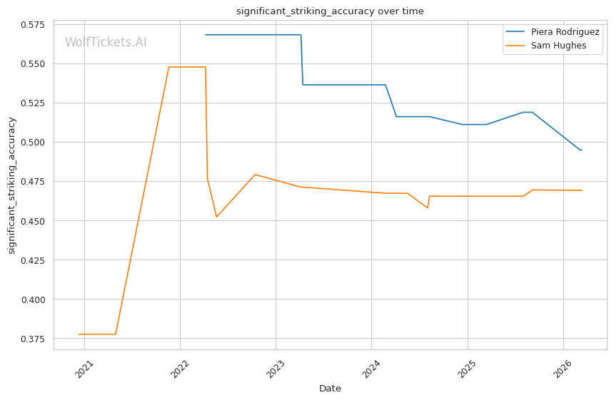 The model's perfect confidence score reflects the stylistic mismatch. Rodriguez's significant striking impact differential, takedown volume, and proven success against Hughes in their first meeting all point to the same outcome. WolfTicketsAI picks Piera Rodriguez to win this rematch.