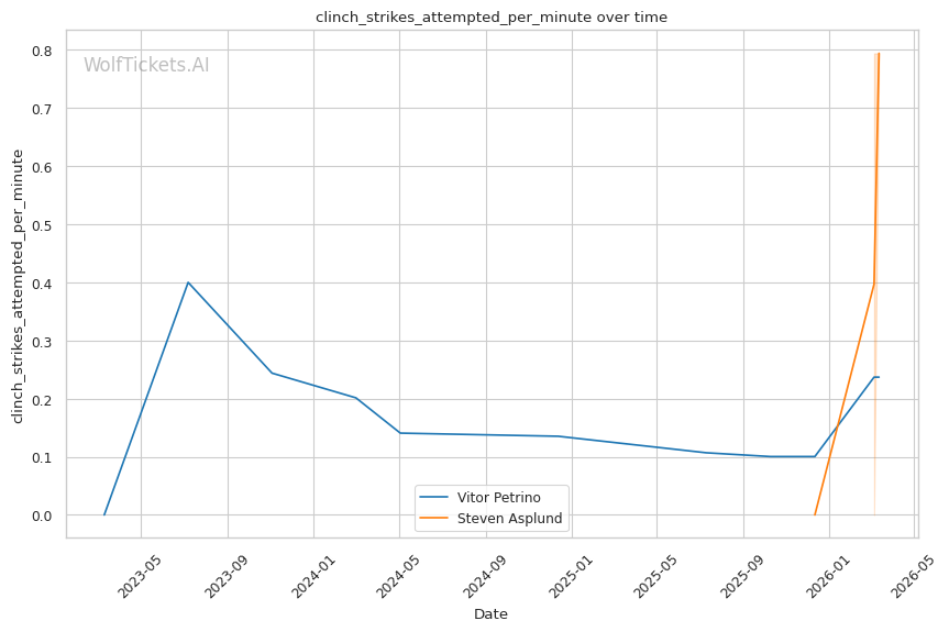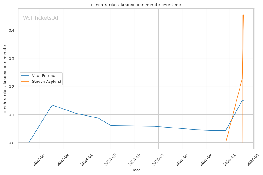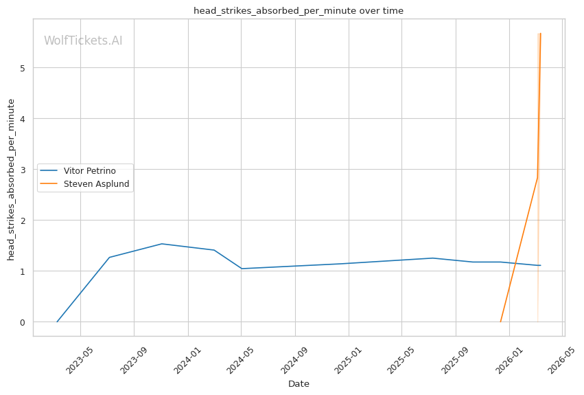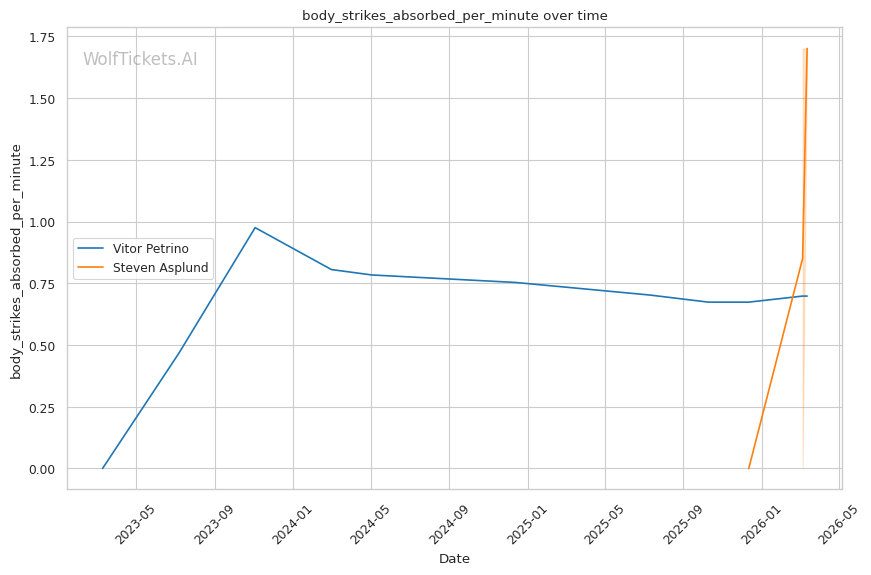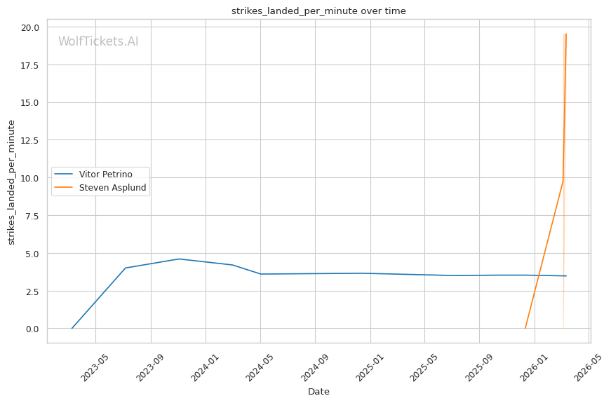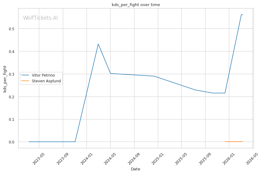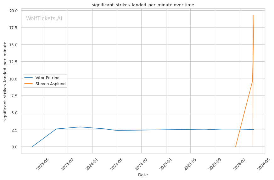 Asplund's high-volume jab could exploit Petrino's tendency to keep his head on the centerline when pressuring forward. Petrino has shown he can be timed with straight punches, as Jacoby demonstrated with the knockout right hand. Asplund's ability to land 170 significant strikes in under 9 minutes suggests he can accumulate damage before Petrino finds his timing.