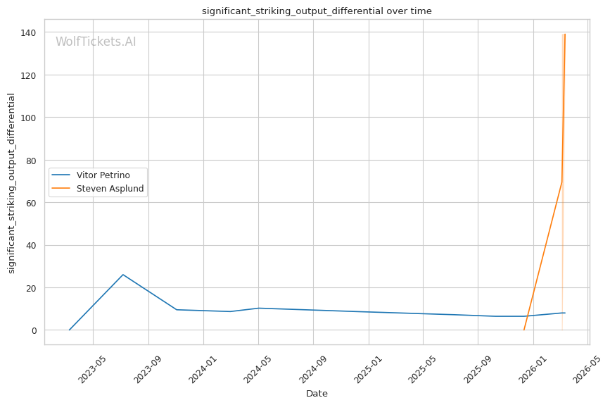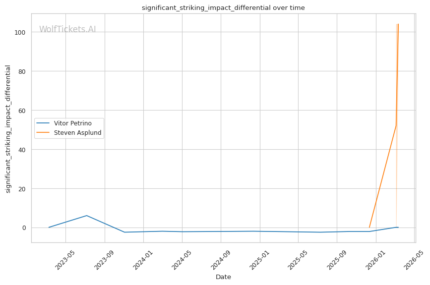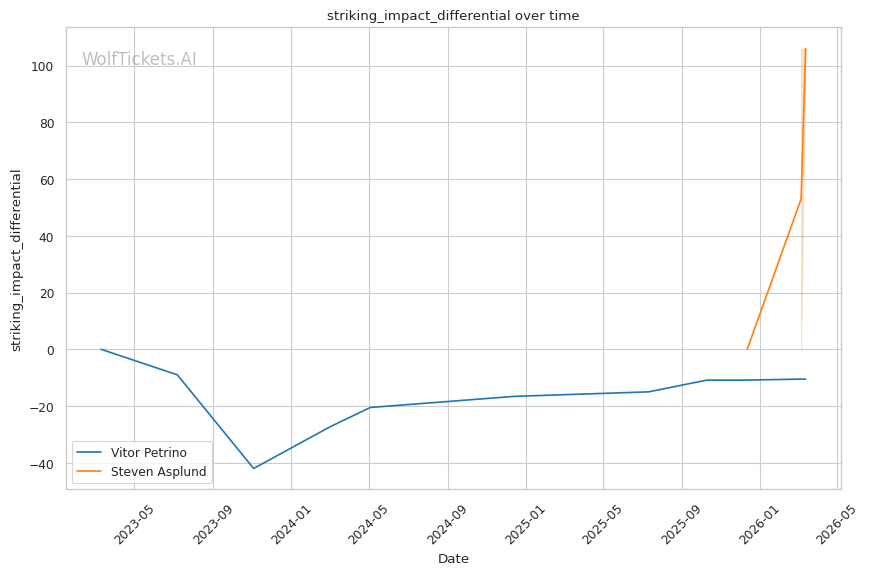 Significant Striking Impact Differential decreased the score by 5.0 - Petrino's power advantage is acknowledged but not enough to overcome other factors.