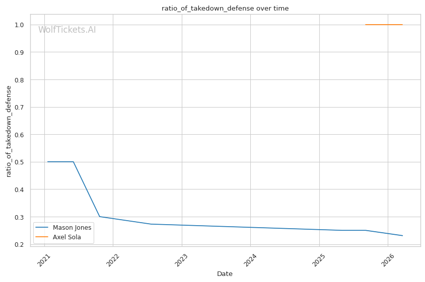 Takedown Defense Concerns: Jones's takedown defense ratio of 23% is a glaring weakness. Against Ludovit Klein in his unanimous decision loss, his inability to keep the fight where he wanted contributed to the defeat. If Sola can get him down, Jones may struggle to escape.