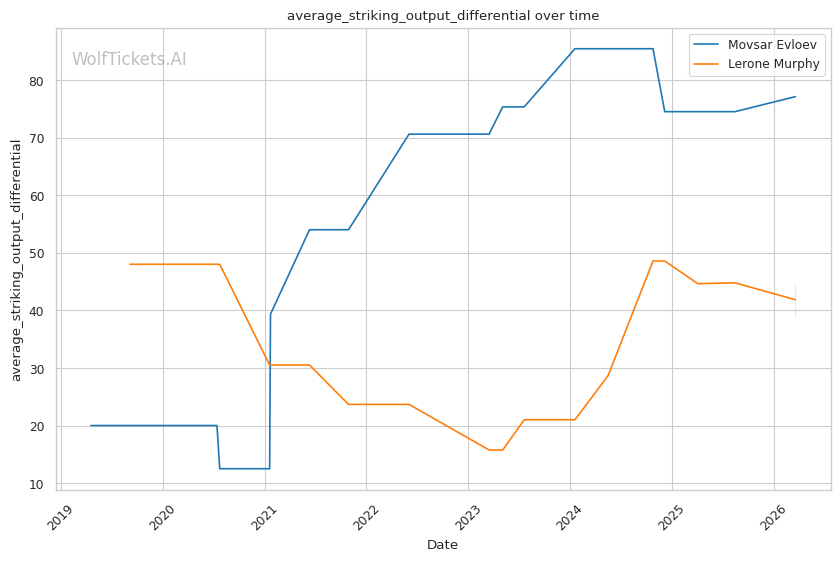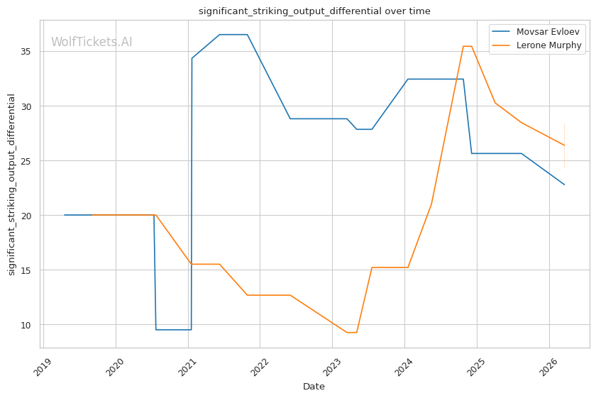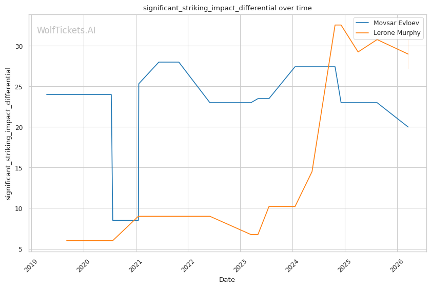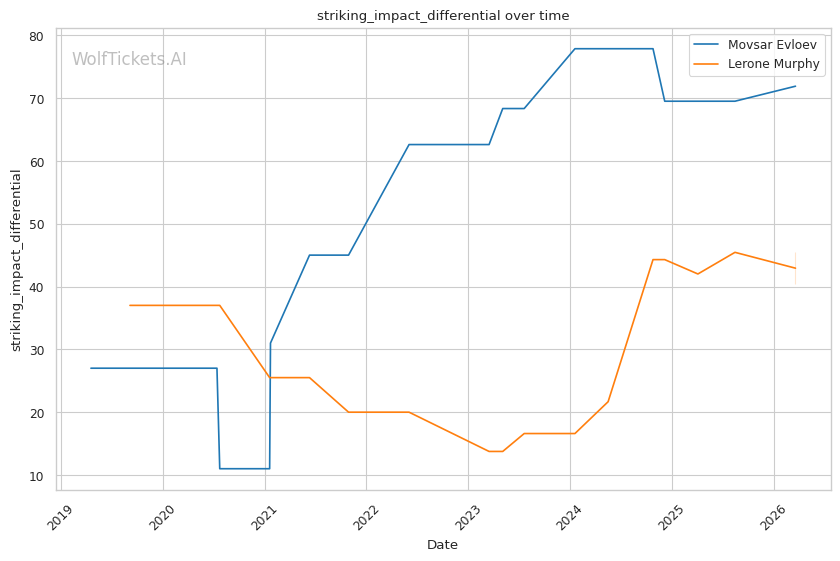 Striking Impact Differential (+1) and Significant Striking Output Differential (+1) slightly favored Evloev, showing he outstrikes opponents more consistently. His Recent Significant Striking Impact Differential (+1) confirms this trend has continued in recent fights.