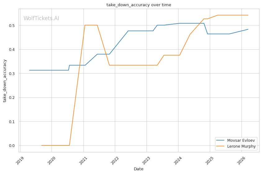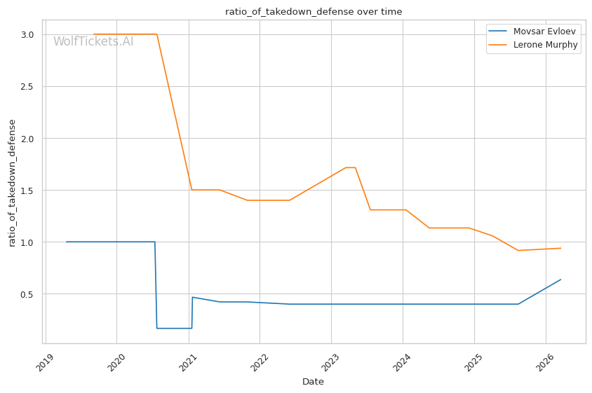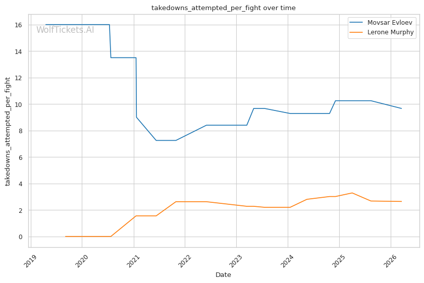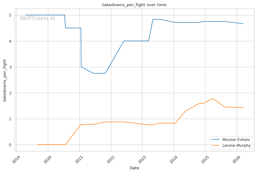 Evloev's takedown volume is the defining factor. He attempts nearly 10 takedowns per fight and lands almost 5. Murphy has faced wrestlers, but none with Evloev's relentless chain wrestling.