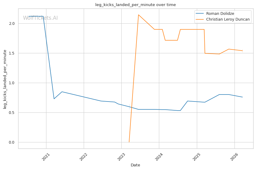 Duncan should establish dominance quickly. His inside low kicks will start accumulating damage immediately. Dolidze's static stance makes him an easy target for these attacks. Duncan's length advantage (79" reach vs 76") allows him to operate at distance where Dolidze struggles.