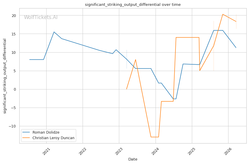 Christian Leroy Duncan should handle Roman Dolidze. Duncan's spinning attack arsenal targets exactly the defensive gaps Dolidze has shown throughout his career. Dolidze's broken shoulder roll mechanics, static stance, and tendency to mentally disengage when his gameplan fails all play into Duncan's hands. The British fighter has momentum, improved skills, and the finishing ability to end this fight spectacularly. WolfTicketsAI backs Duncan to extend his win streak and potentially crack the middleweight rankings.