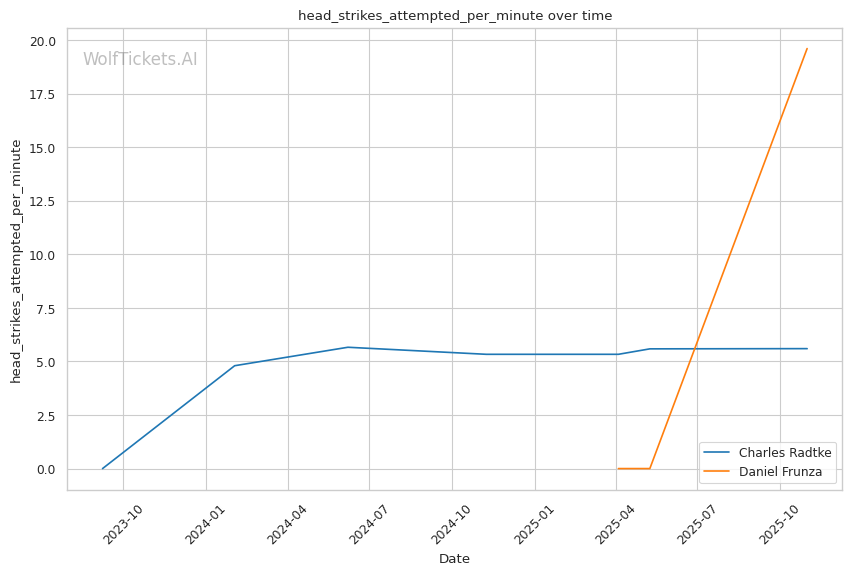 His striking volume is impressive at 10.0 strikes landed per minute and 8.6 significant strikes per minute—significantly higher than Radtke's 4.73 and 3.11 respectively. Frunza throws 19.6 head strikes attempted per minute, showing he's willing to let his hands go. He also mixes in leg kicks effectively (1.8 landed per minute) and shows variety with clinch work (1.2 clinch strikes per minute).