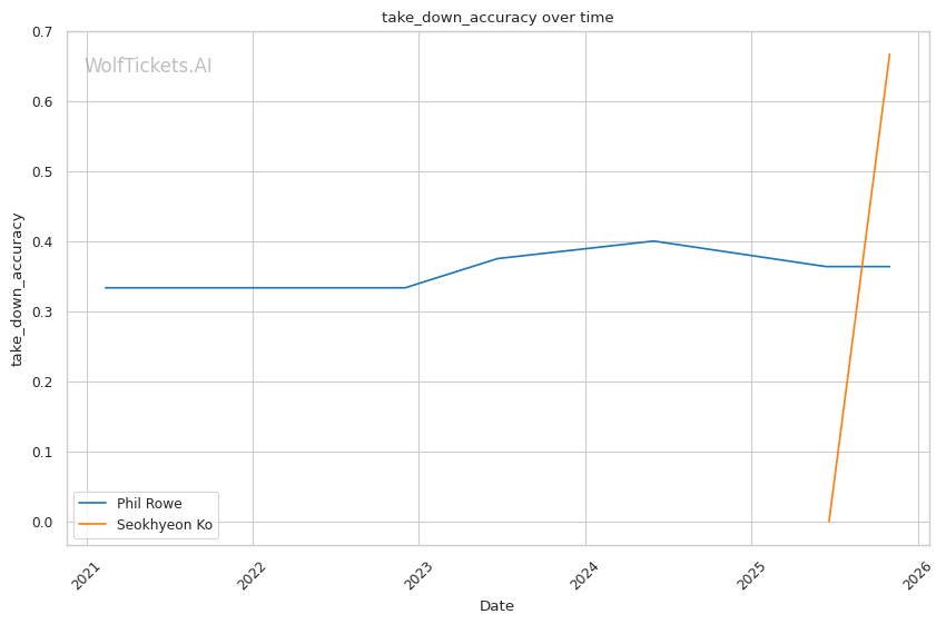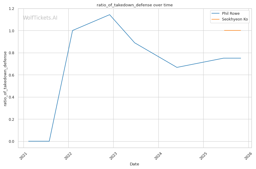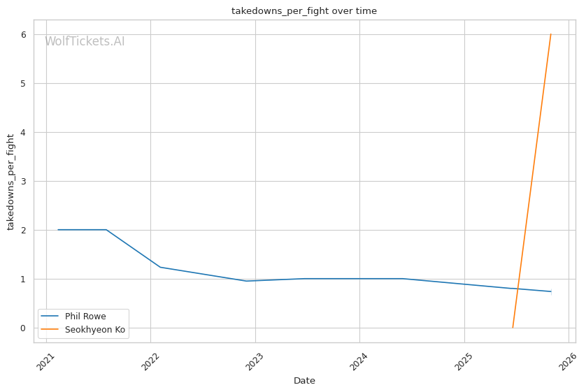Recent Takedowns Attempted per Fight decreased Rowe's score by 2 points. Rowe attempts 2.01 takedowns per fight recently but lands only 34.57%, while Ko attempts 9.0 per fight with 66.67% accuracy and perfect takedown defense. This grappling disparity is decisive.