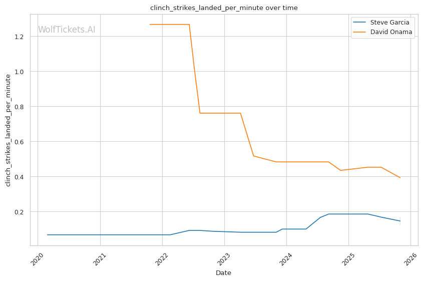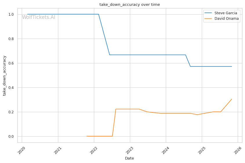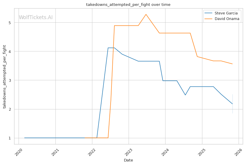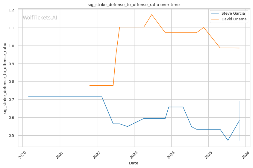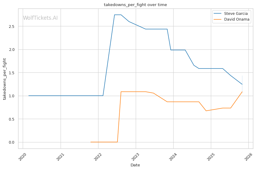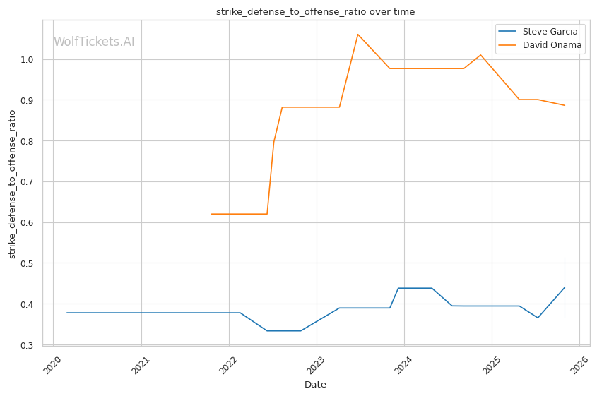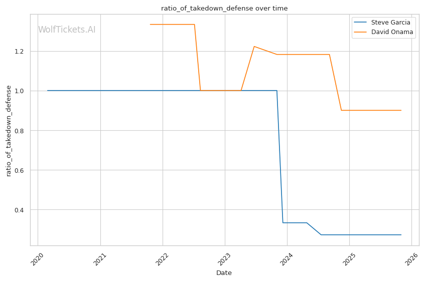Onama's 99% recent takedown defense ratio means Garcia's occasional takedown attempts (1.06 per fight) won't threaten him. This forces Garcia to win purely on the feet where both fighters are dangerous.