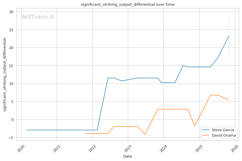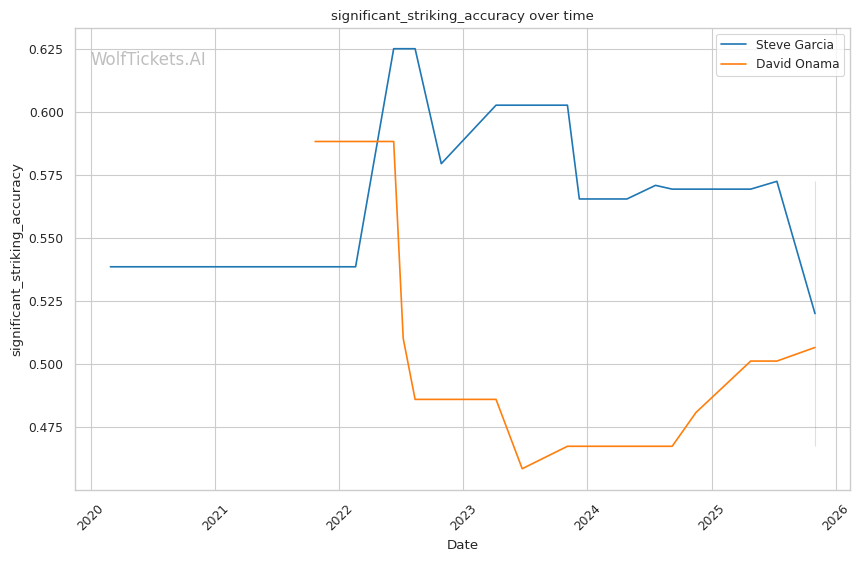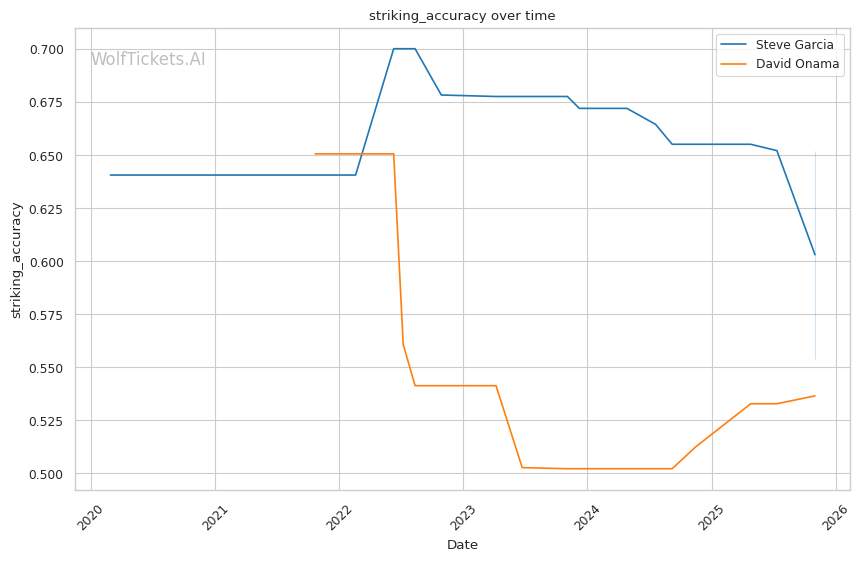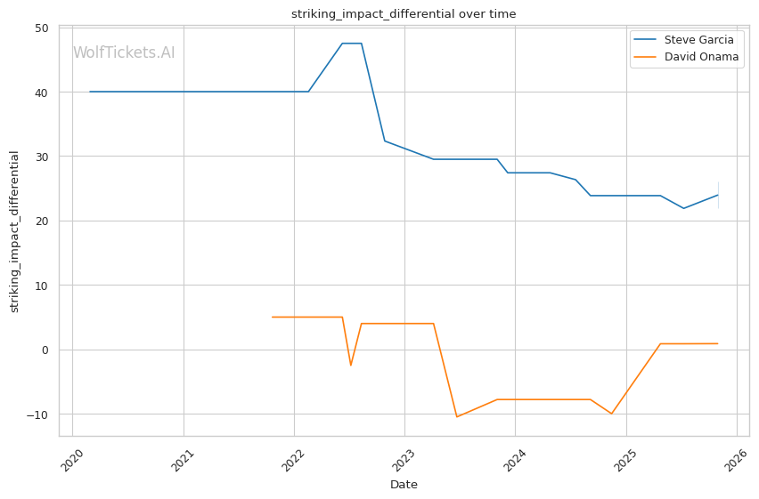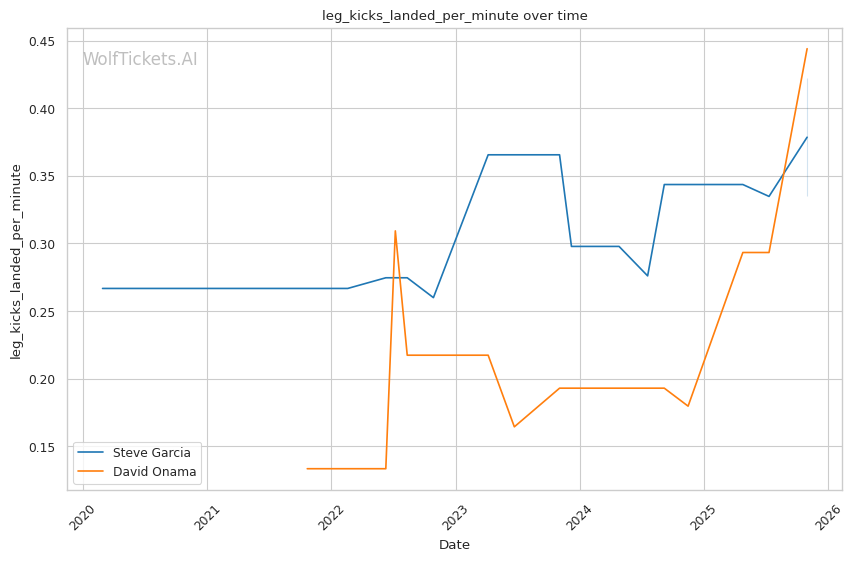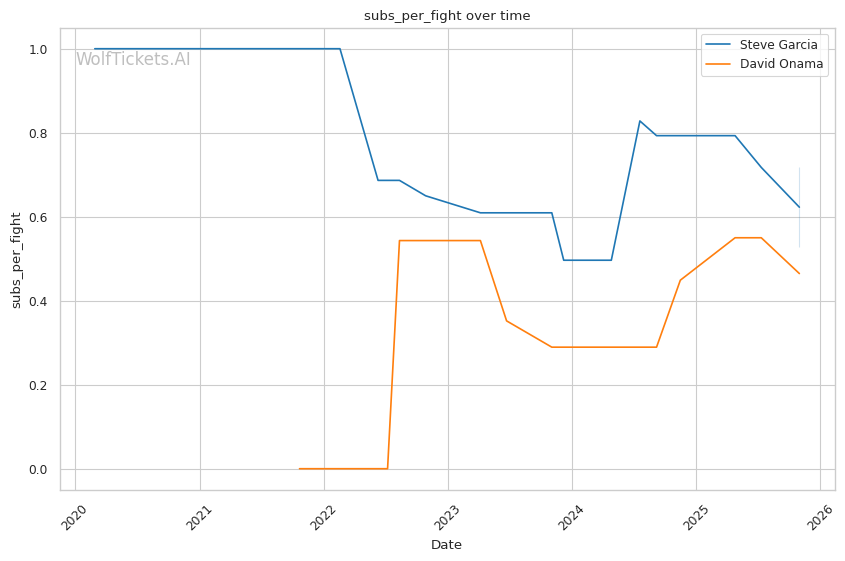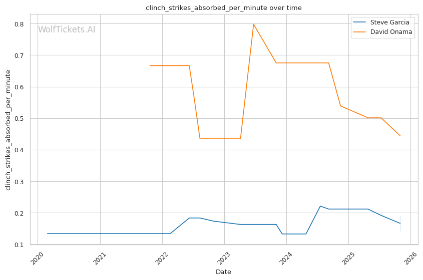 Onama's 99% recent takedown defense ratio means Garcia's occasional takedown attempts (1.06 per fight) won't threaten him. This forces Garcia to win purely on the feet where both fighters are dangerous.