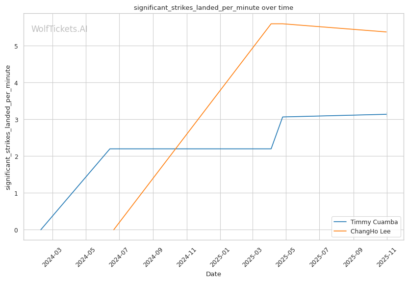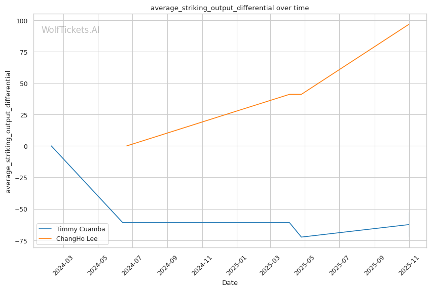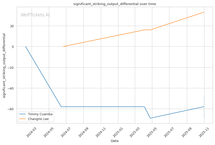 Cuamba's volume drops significantly as fights progress—his output collapsed in Round 3 against Oki, and he was dominated for two rounds before his late rally against Almeida. Lee's grinding style and high-volume striking (12.14 strikes per minute) could replicate that pressure. However, Lee's recent stats show declining performance: his significant striking impact differential dropped from +24.5 overall to +14.85 recently, suggesting his own cardio or effectiveness may wane.
