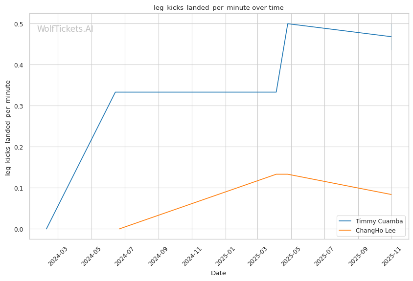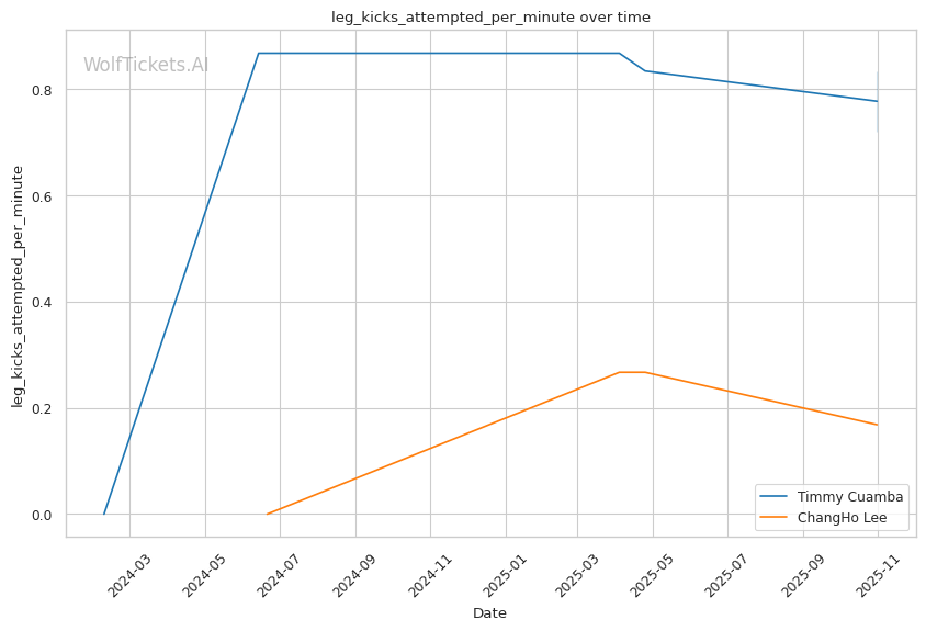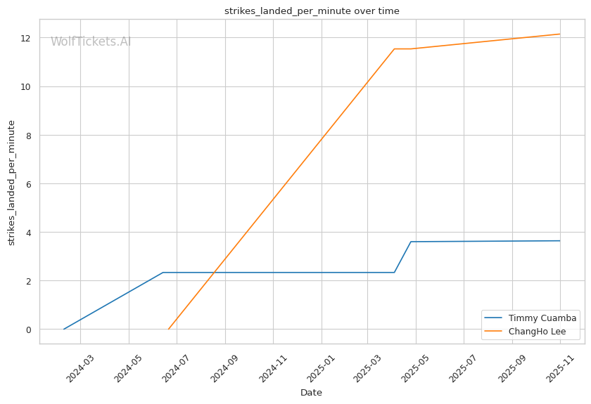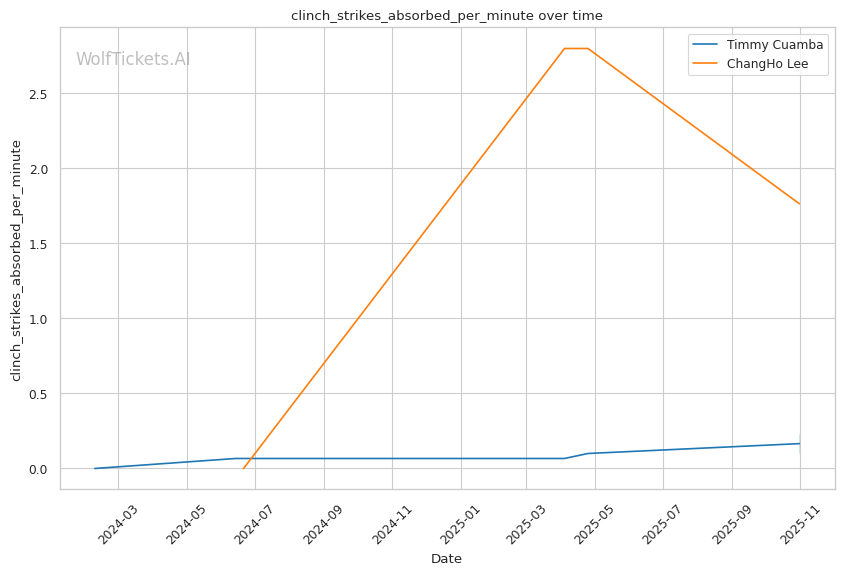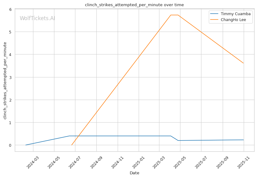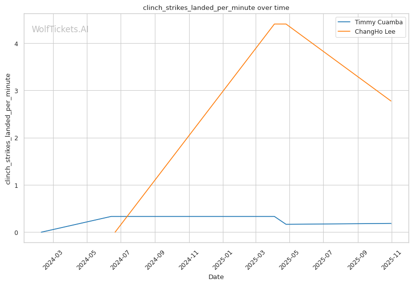 Cuamba's output craters when opponents maintain forward pressure. Oki's relentless jab left Cuamba's face "red" by the end of Round 1, and Cuamba had no answer—just 2.53 significant strikes per minute while eating constant volume. Against Almeida's pressure and power, Cuamba's movement-based game disappeared entirely in the Apex's small cage. He needs space to operate, and when opponents take it away, he becomes reactive rather than offensive. Lee's grinding top game and willingness to work in the clinch (2.77 clinch strikes landed per minute) could replicate this pressure dynamic.