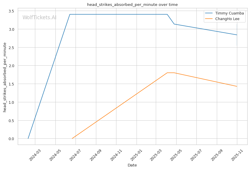 Lee absorbed a clean elbow across his brow early against Romious that opened a cut, indicating defensive gaps when working at close range. The cross-brow cut suggests he either mistimed head movement or failed to maintain proper guard structure with his lead shoulder. His 26.32% recent significant striking defense is alarming—he's absorbing 1.18 head strikes per minute recently while his overall defense sits at just 21.33%. Against Cuamba's exceptional hand speed and counter right hand, these defensive holes could prove catastrophic. Lee tends to accept strikes while closing distance, a strategy that works against slower opponents but could backfire against someone who lands first consistently.