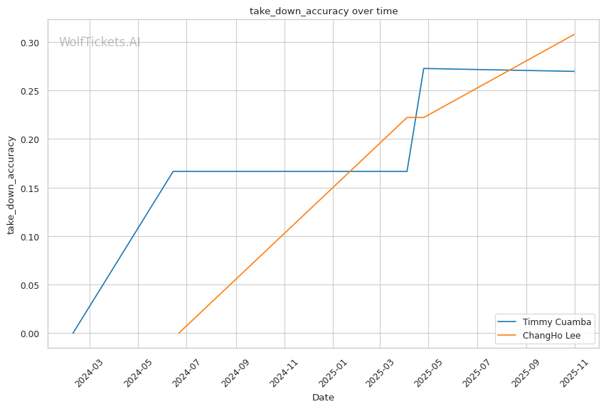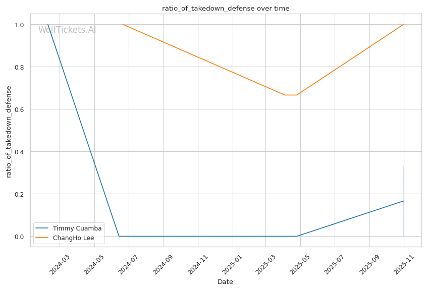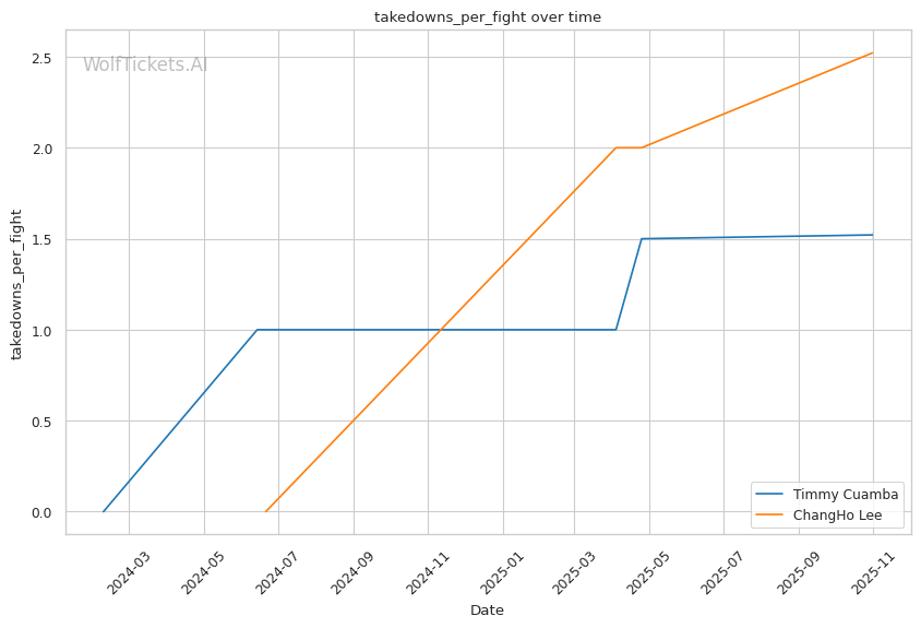 Lee's takedown success against Romious came from capitalizing on his opponent's kick attempt—a reactive entry rather than manufactured opportunity. He waited for Romious to compromise his own base rather than creating openings through feints, level changes, or striking combinations. Against Cuamba, who uses wrestling defensively and will be wary of kicking without setup, Lee may struggle to find entries from open space. His 19.43% recent takedown accuracy (down from 30.77% overall) suggests his entries are becoming more predictable. If Cuamba maintains distance and forces Lee to shoot naked singles, Lee's wrestling advantage diminishes significantly.