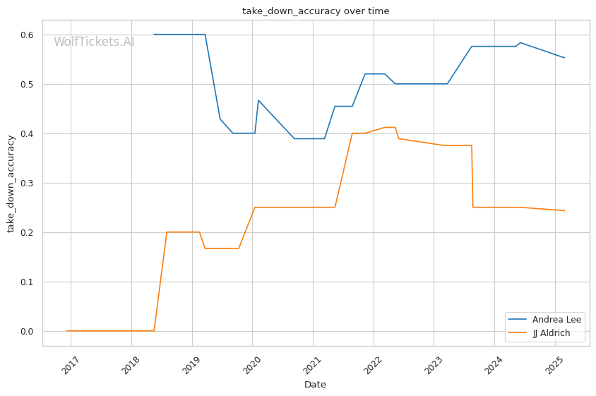 WolfTicketsAI has correctly predicted against Andrea Lee in three of her last five fights (Miranda Maverick, Natalia Silva), but incorrectly backed her in fights against Maycee Barber and Viviane Araujo. The model has been inconsistent with Aldrich, correctly backing her against Liang Na and Gillian Robertson, but missing on her fights against Veronica Hardy, Montana De La Rosa, and Ariane Lipski.