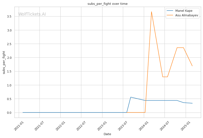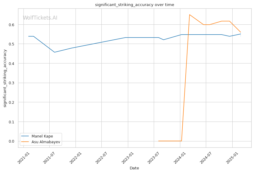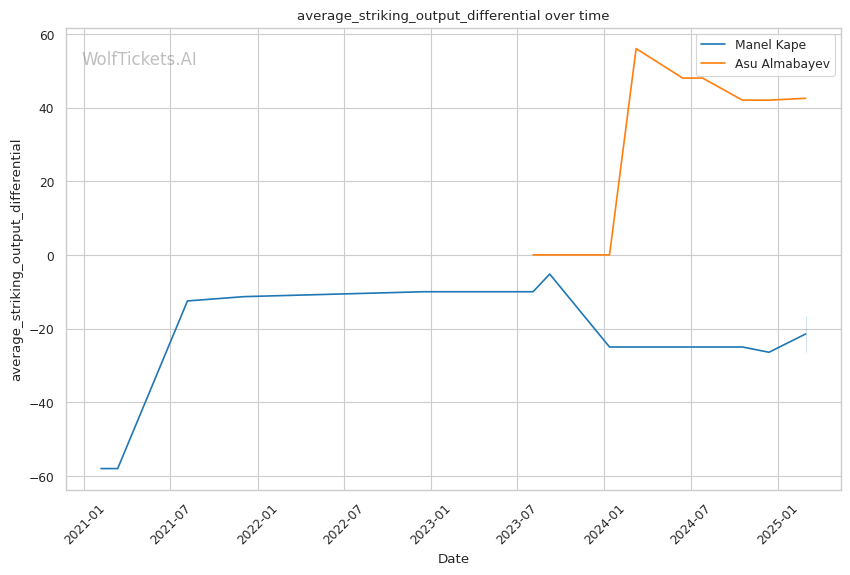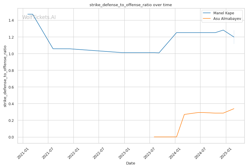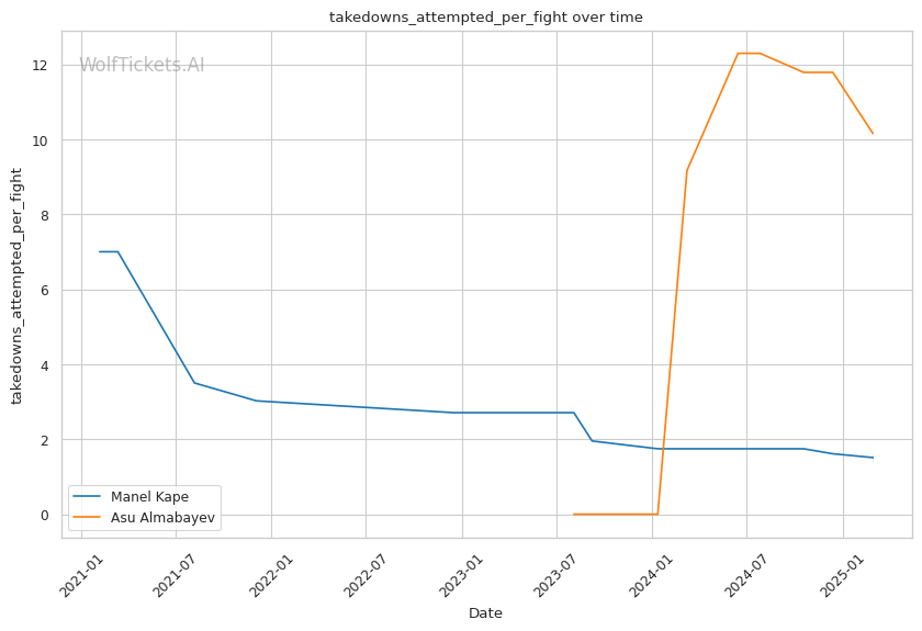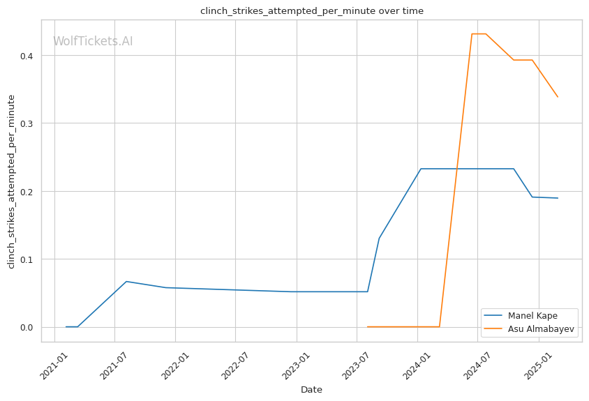 Striking differential: Kape lands 5.0 significant strikes per minute with a 58% defense rate compared to Almabayev's 2.1 per minute. When the fight stays standing, Kape has a clear edge.