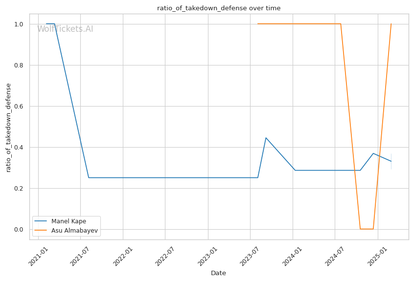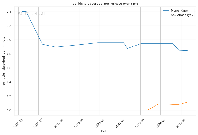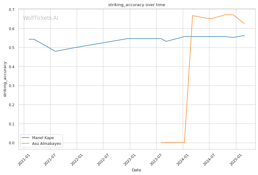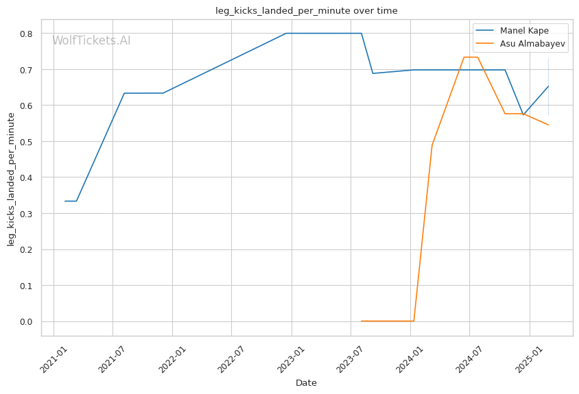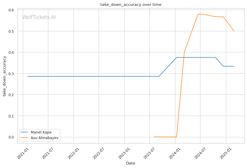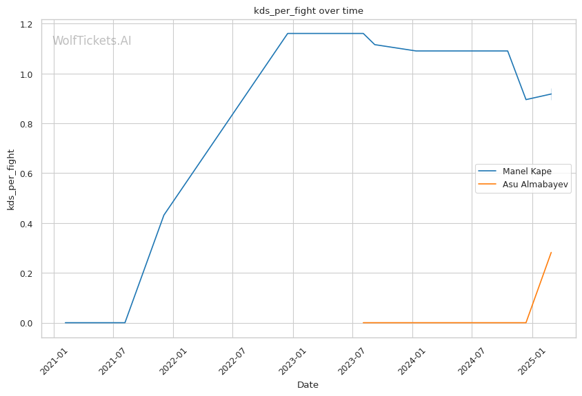 Power advantage: Kape averages 0.94 knockdowns per fight compared to Almabayev's 0.28, showing significantly more fight-ending power.