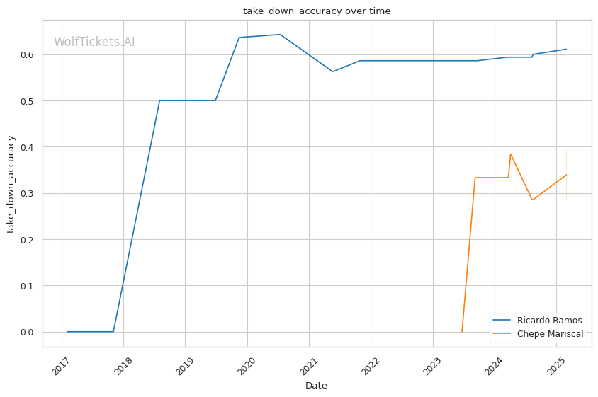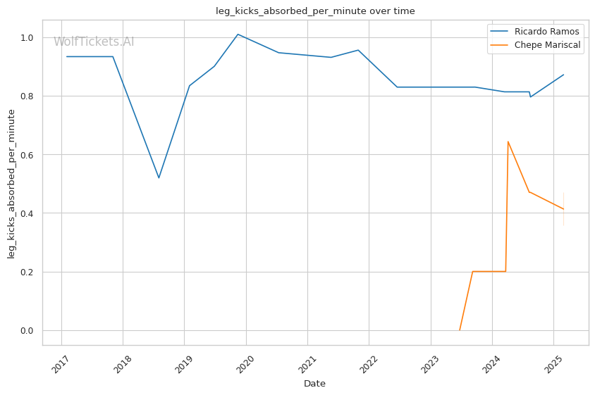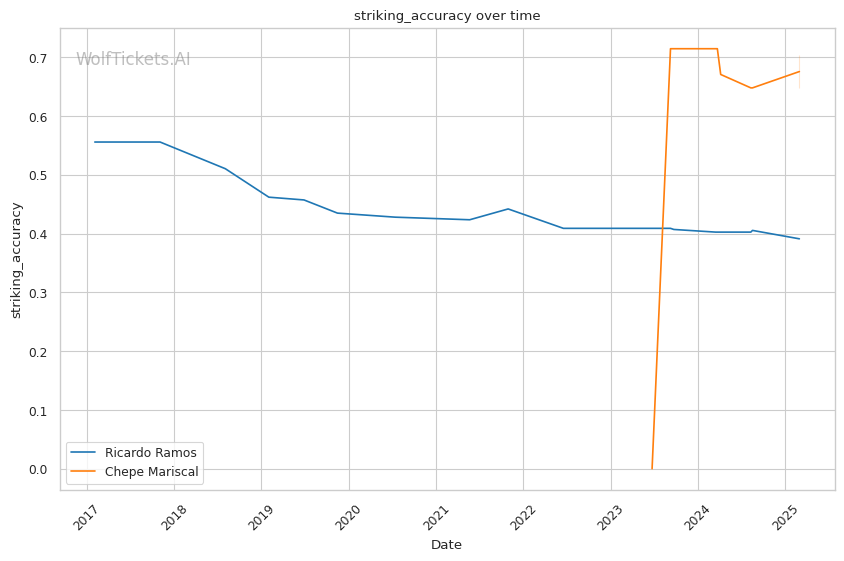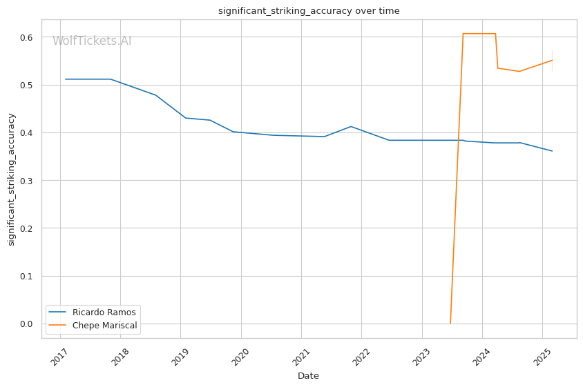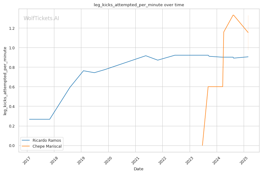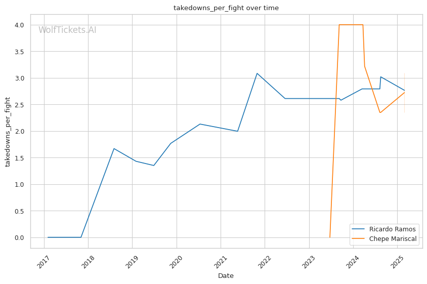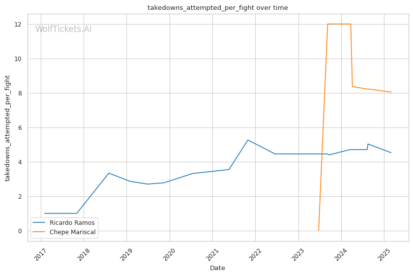 Mariscal's most impressive UFC win came against Jack Jenkins, finishing him via TKO in round two. His pressure overwhelmed Jenkins and forced him into defensive positions. Though Mariscal has a lower takedown accuracy (0.3929) than Ramos, his volume of attempts (7.8775 per fight) shows his commitment to mixing his attack between striking and grappling.