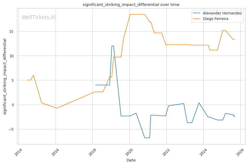 The model's confidence stems from several key statistical advantages. Odds provided the largest boost (+5.0), reflecting Hernandez as the betting favorite. TrueSkill ratings (+4.0) and Recent Win Percentage (+2.0) show Hernandez's superior recent form with three straight wins compared to Ferreira's 2-3 record in his last five. Recent Takedowns Attempted per Fight (+1.0) and Striking Defense Percentage (+1.0) suggest Hernandez's improved defensive metrics, while Recent Striking Impact Differential (+1.0) indicates his power advantage in recent performances.