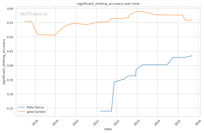This matchup heavily favors Gordon's pressure boxing against Garcia's fundamental but limited striking. Garcia's tendency to throw wide hooks without proper defensive positioning plays directly into Gordon's counter left hook, which he used effectively against Pimblett's similar tendencies. Gordon's improved southpaw stance switching will create timing issues for Garcia, who struggled against the varied looks Drakkar Klose presented.