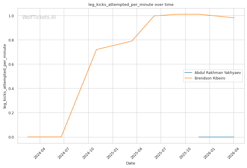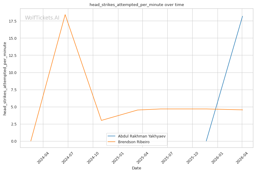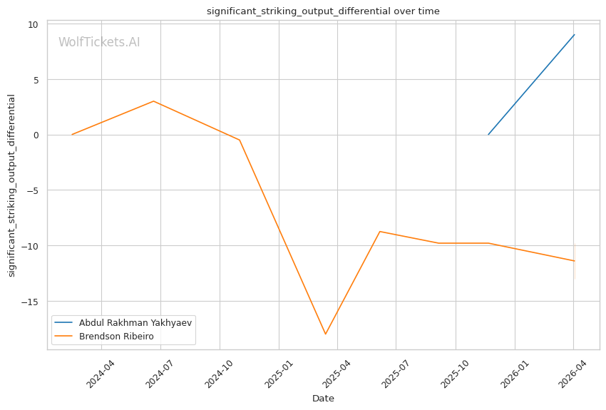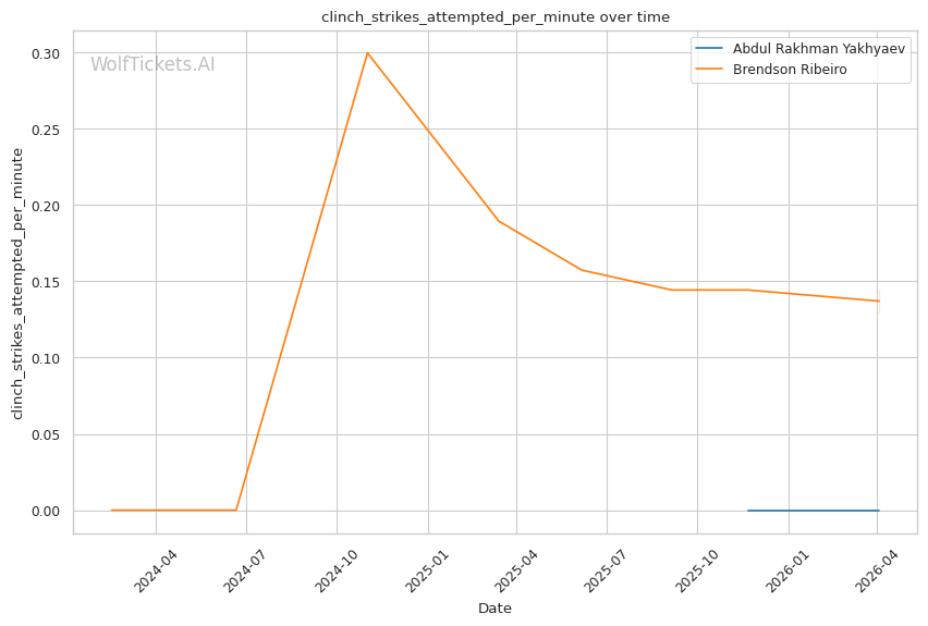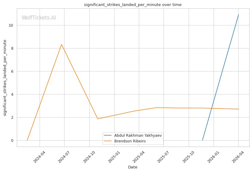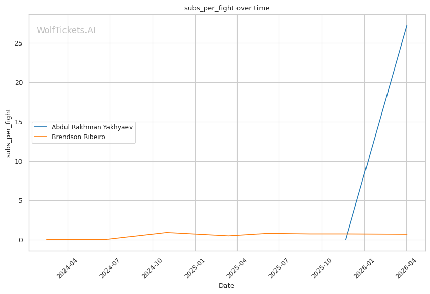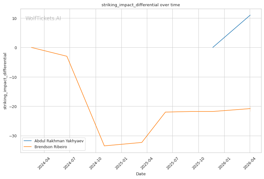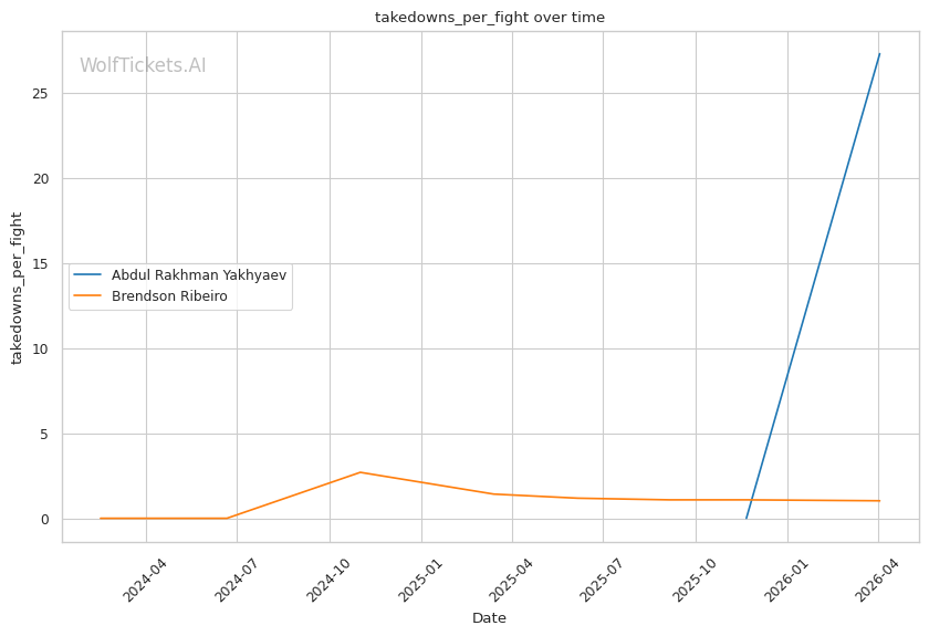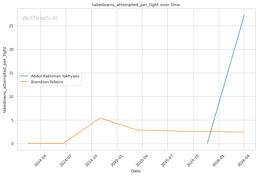 Recent Takedowns Attempted per Fight added 4 points. Yakhyaev's willingness to shoot creates constant threat levels that Ribeiro must respect.