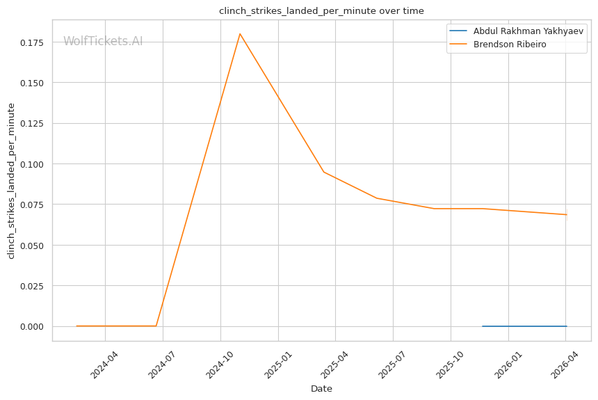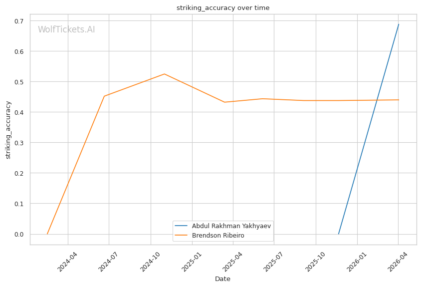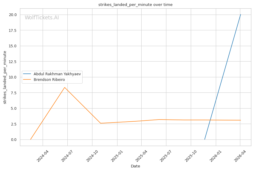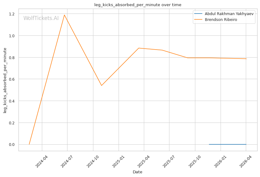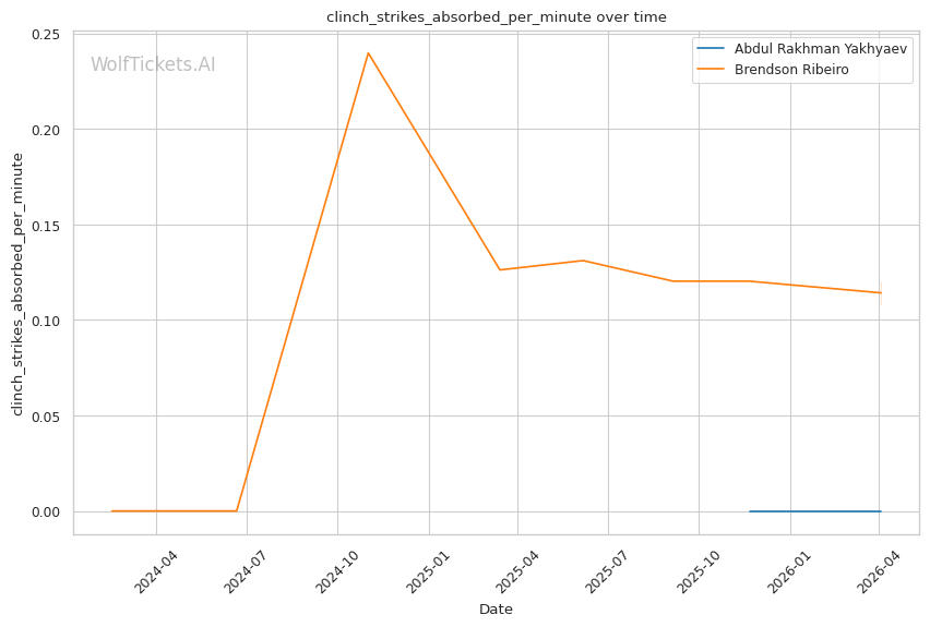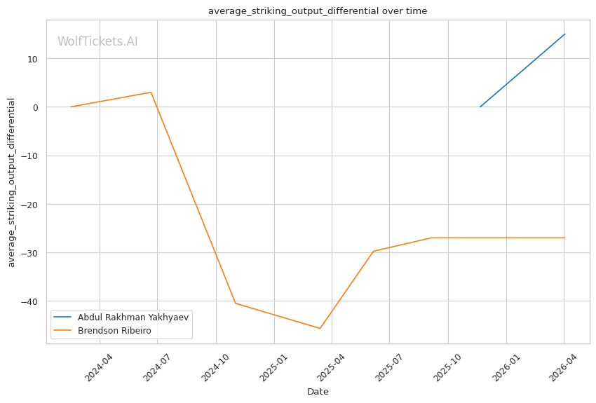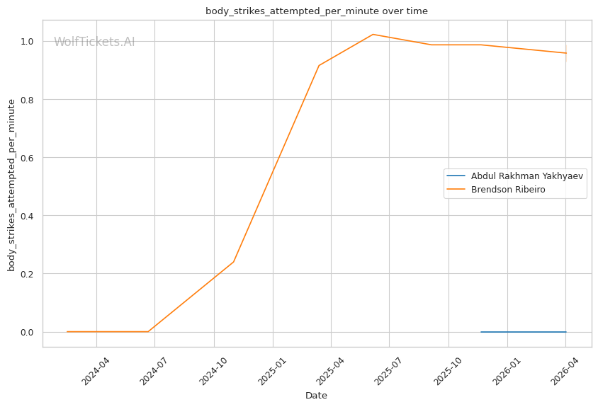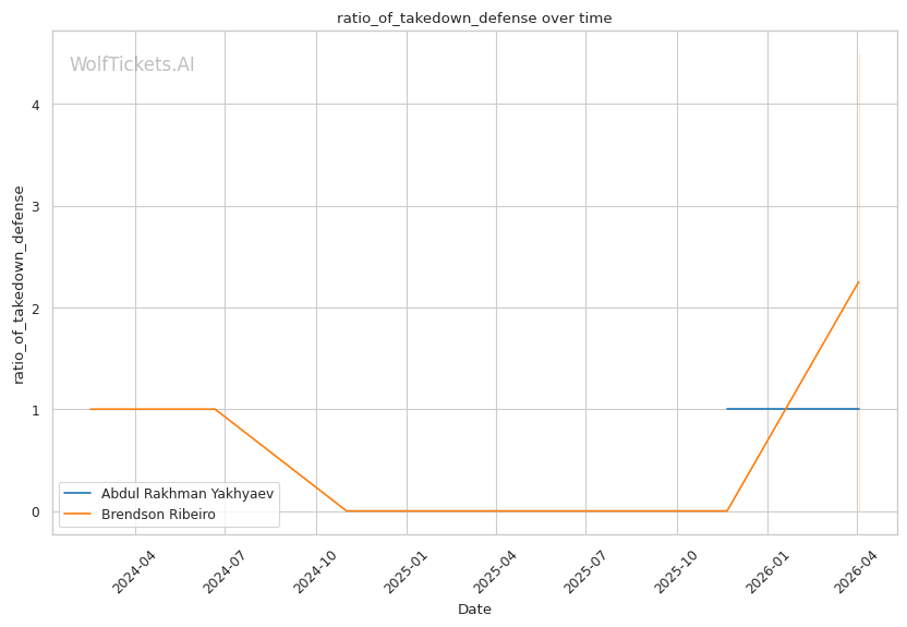 Recent Takedowns Attempted per Fight added 4 points. Yakhyaev's willingness to shoot creates constant threat levels that Ribeiro must respect.