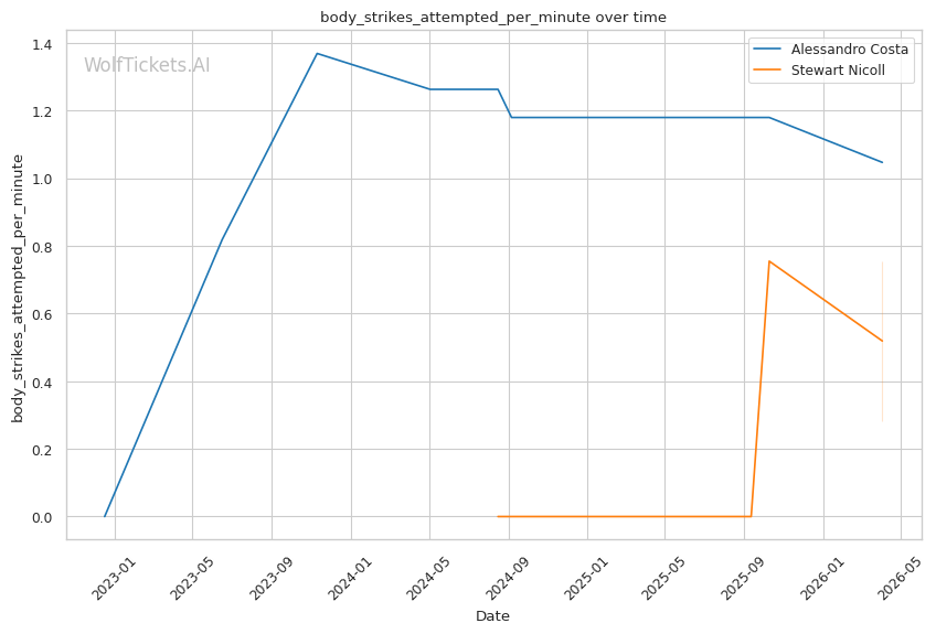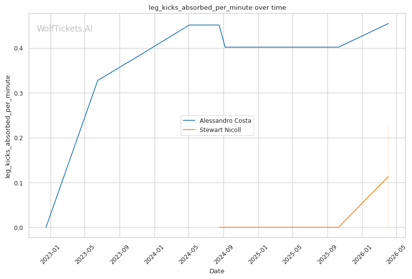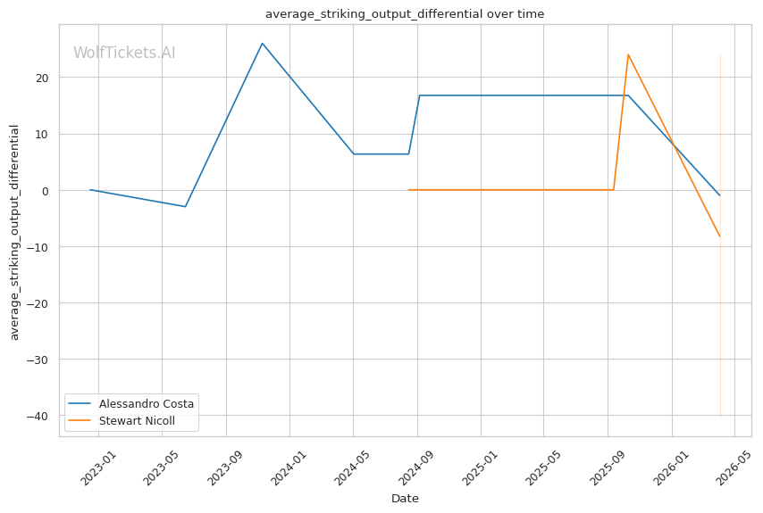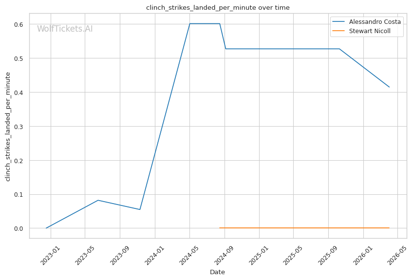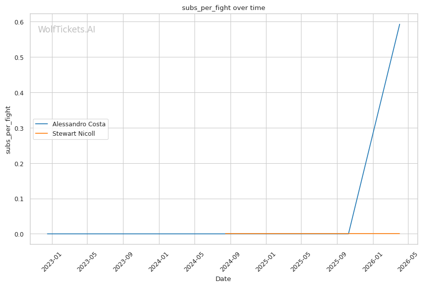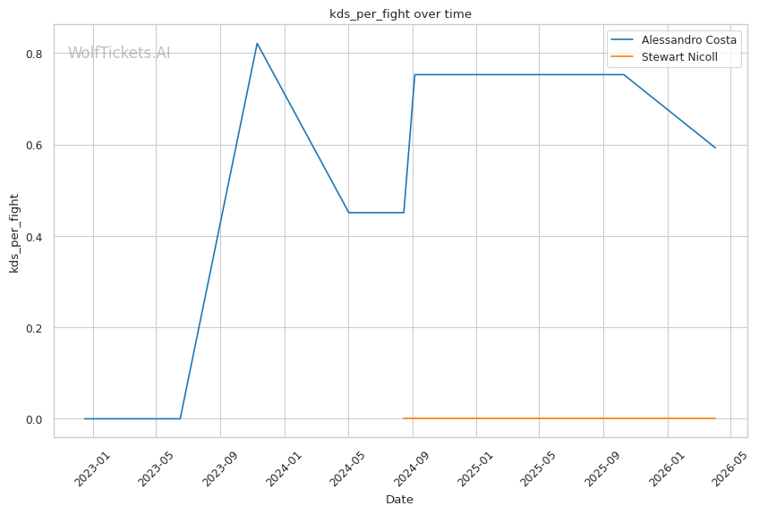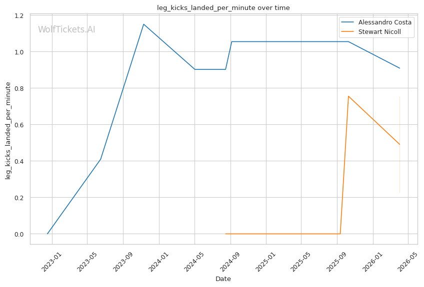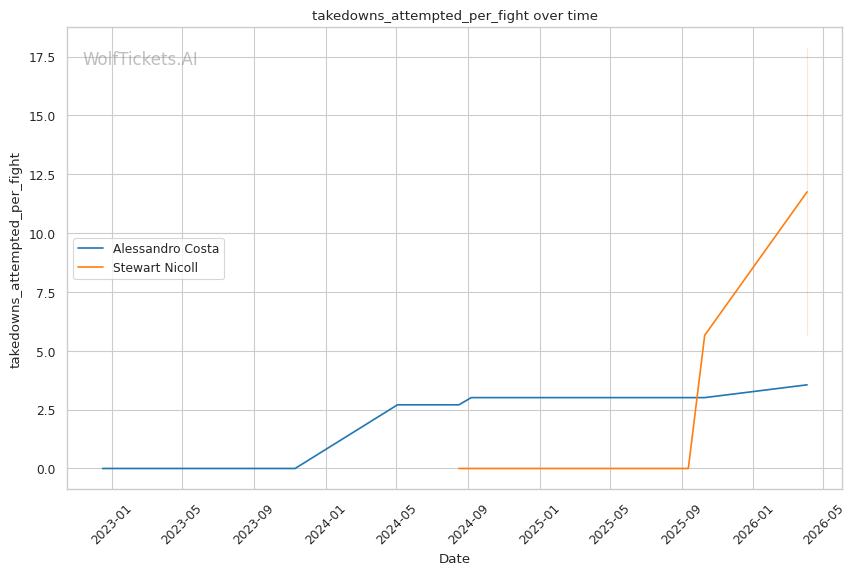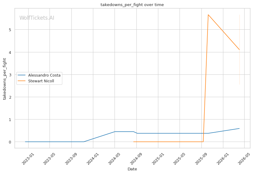 Costa's calf kicks present a nightmare scenario for Nicoll's wrestling-dependent approach. Nicoll needs to close distance and shoot for takedowns, but Costa's leg attacks will punish every entry attempt. Against Borjas, Costa demonstrated how quickly he can compromise a lead leg. Nicoll's 14.29% takedown accuracy suggests he'll need multiple attempts, and each failed shot means eating another calf kick.