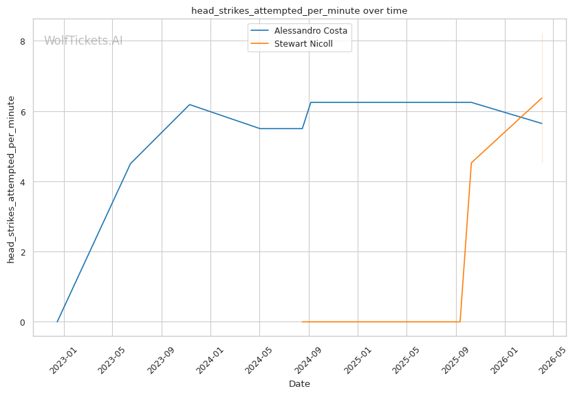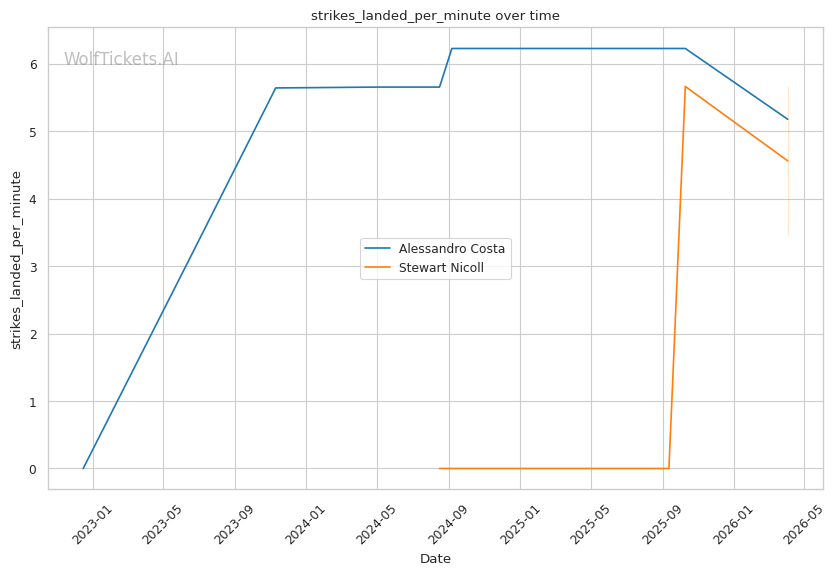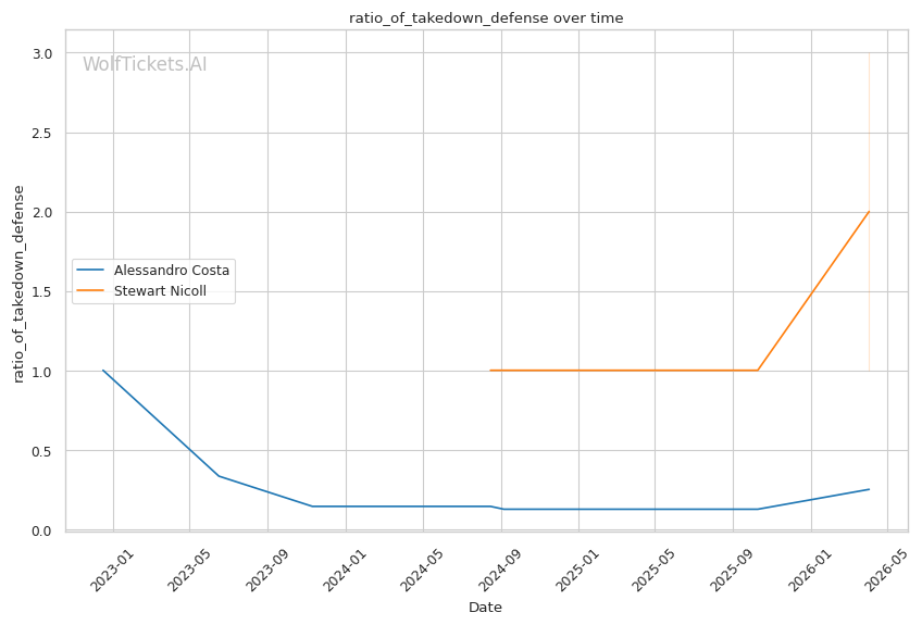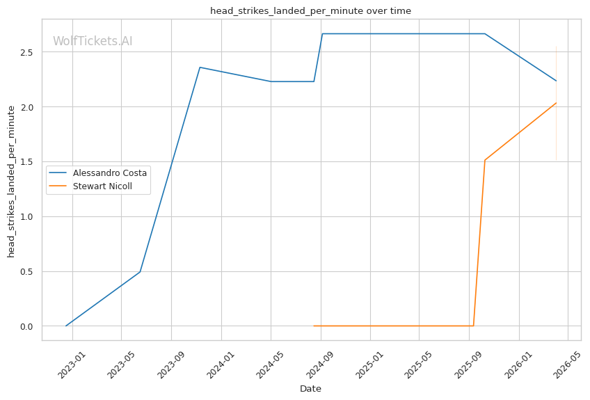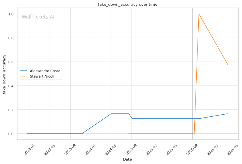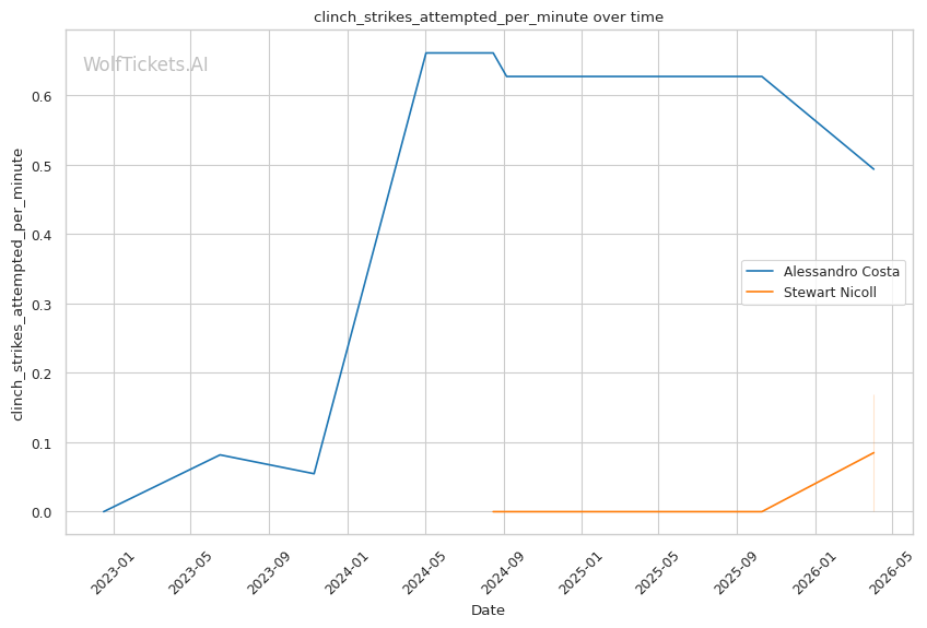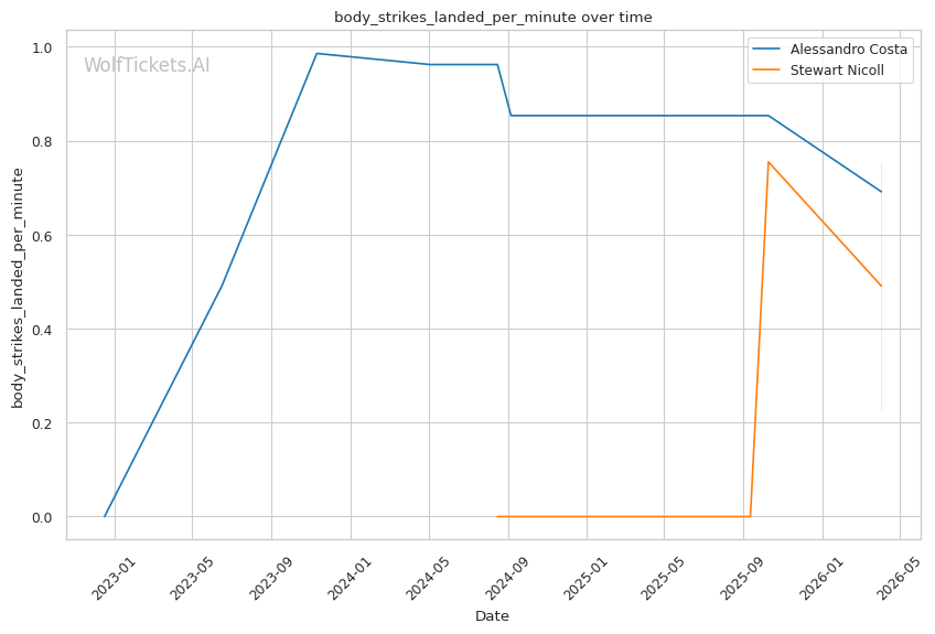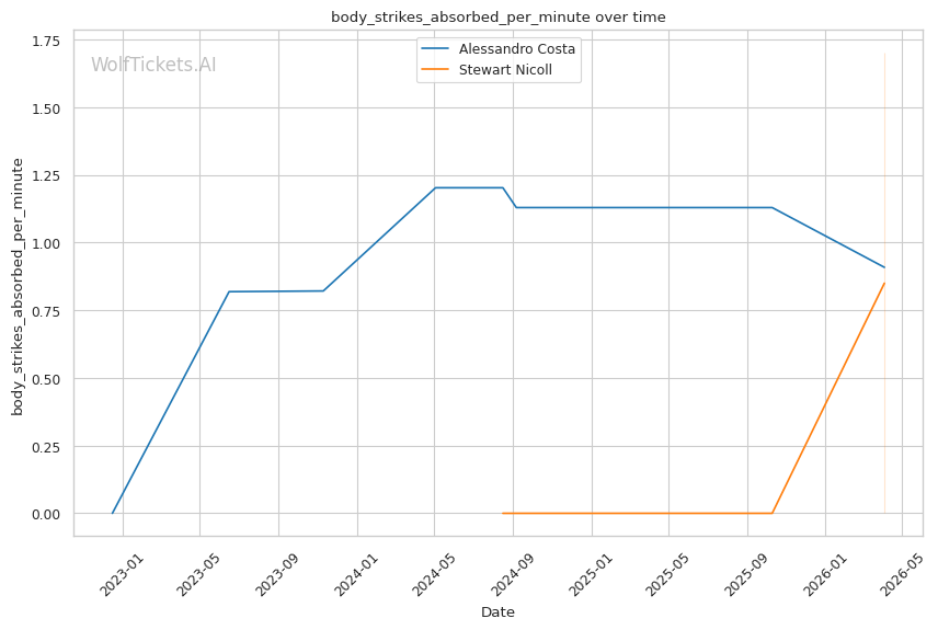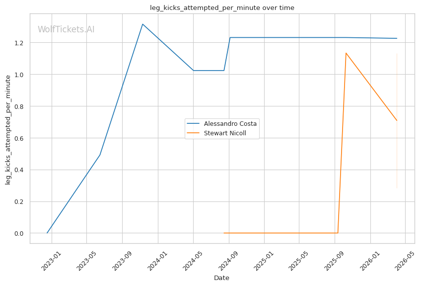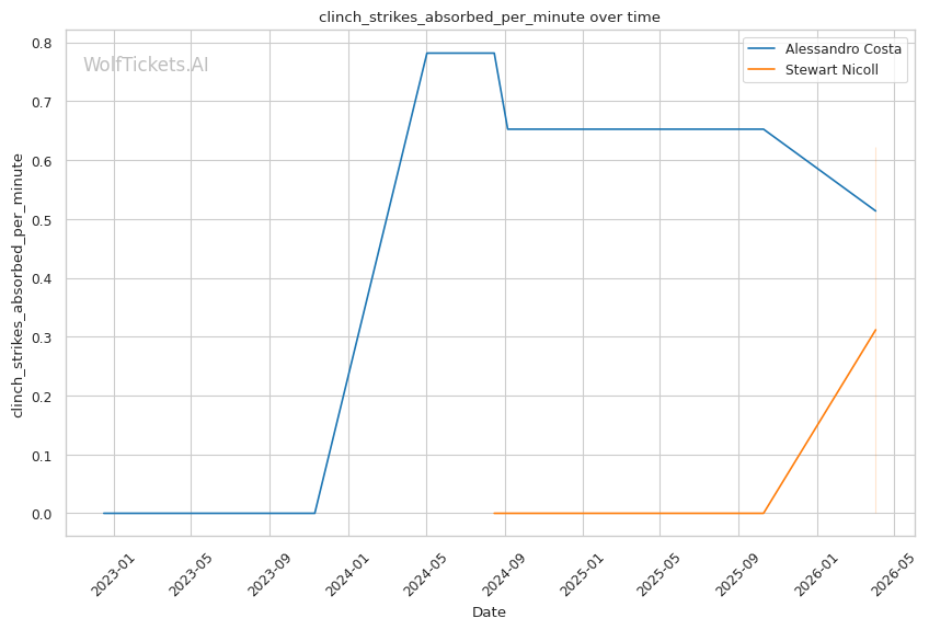 Costa's calf kicks present a nightmare scenario for Nicoll's wrestling-dependent approach. Nicoll needs to close distance and shoot for takedowns, but Costa's leg attacks will punish every entry attempt. Against Borjas, Costa demonstrated how quickly he can compromise a lead leg. Nicoll's 14.29% takedown accuracy suggests he'll need multiple attempts, and each failed shot means eating another calf kick.