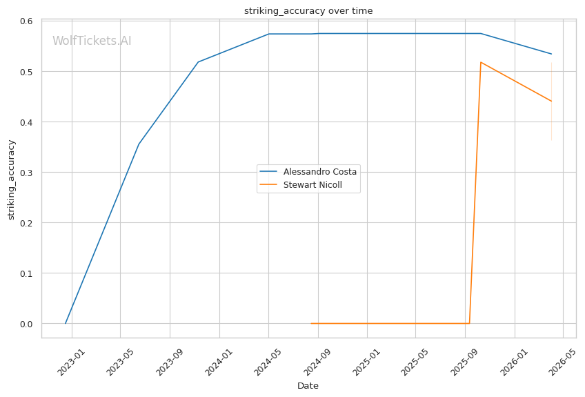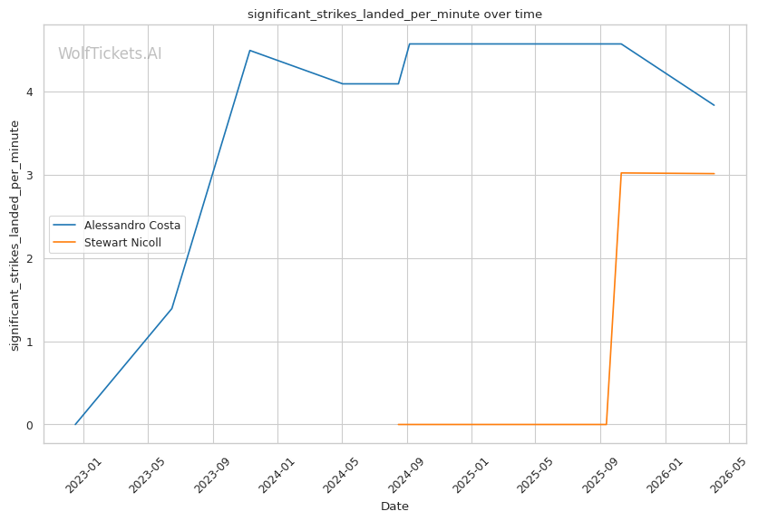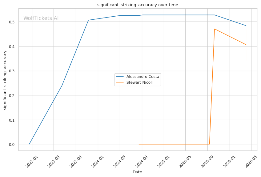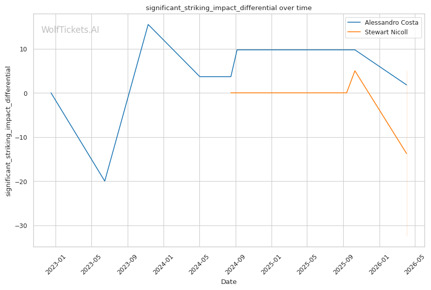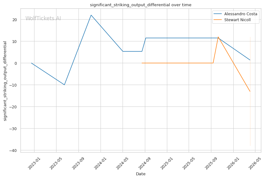 Costa's power punching also matches up well against Nicoll's striking deficiencies. Nicoll's significant striking defense sits at 48.92%, and his recent significant striking defense has dropped to just 27.27%. Costa lands 3.83 significant strikes per minute and carries finishing power that Nicoll hasn't faced at the regional level.