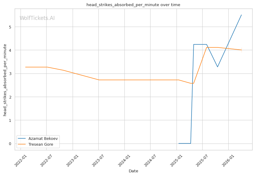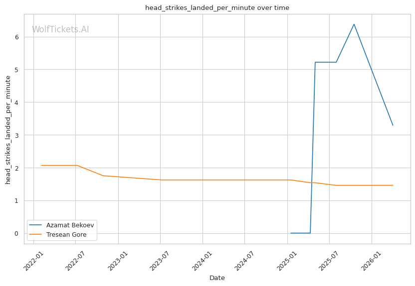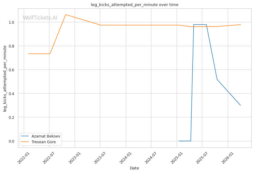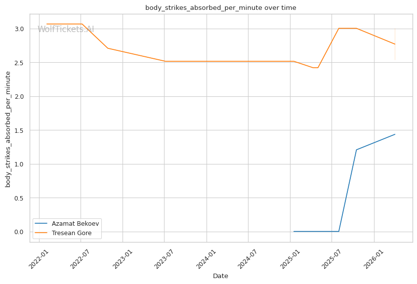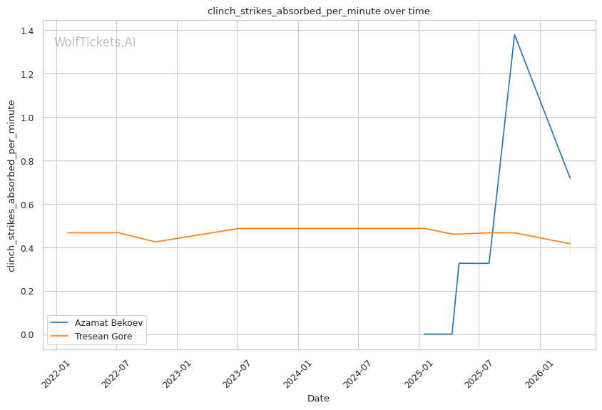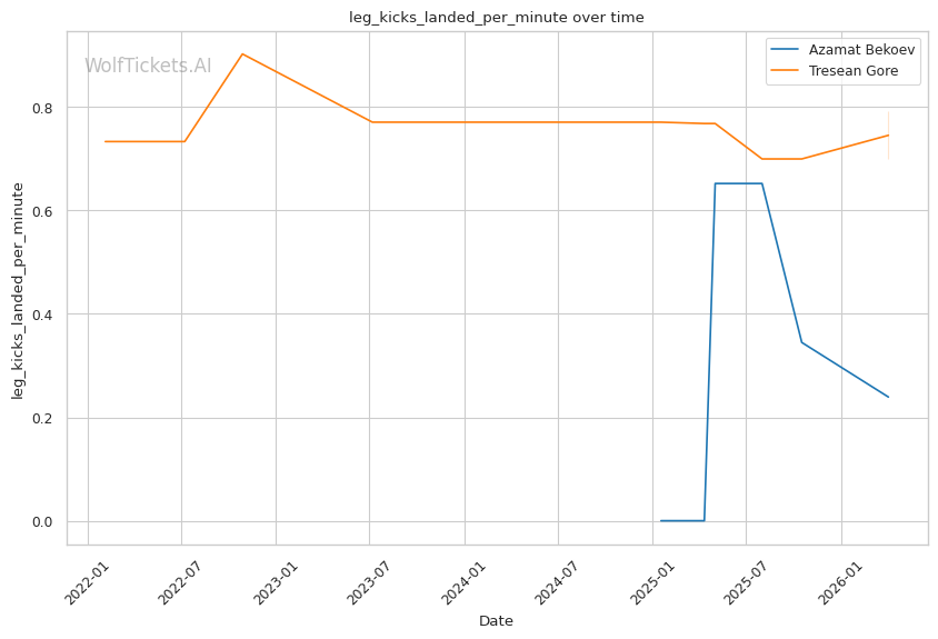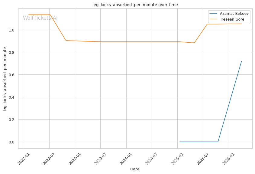 Lead Leg Vulnerability: Gore maintains a heavy front leg stance that leaves him susceptible to low kicks. Tulio targeted this in Round 2, visibly compromising Gore's mobility by mid-round. Bekoev's leg kicks (0.24 landed per minute) could accumulate damage here.