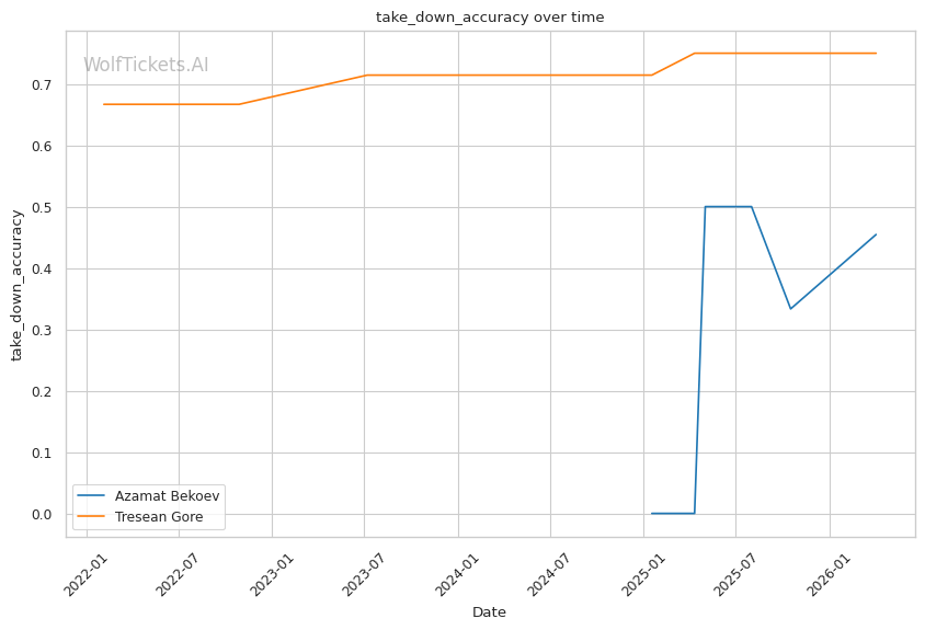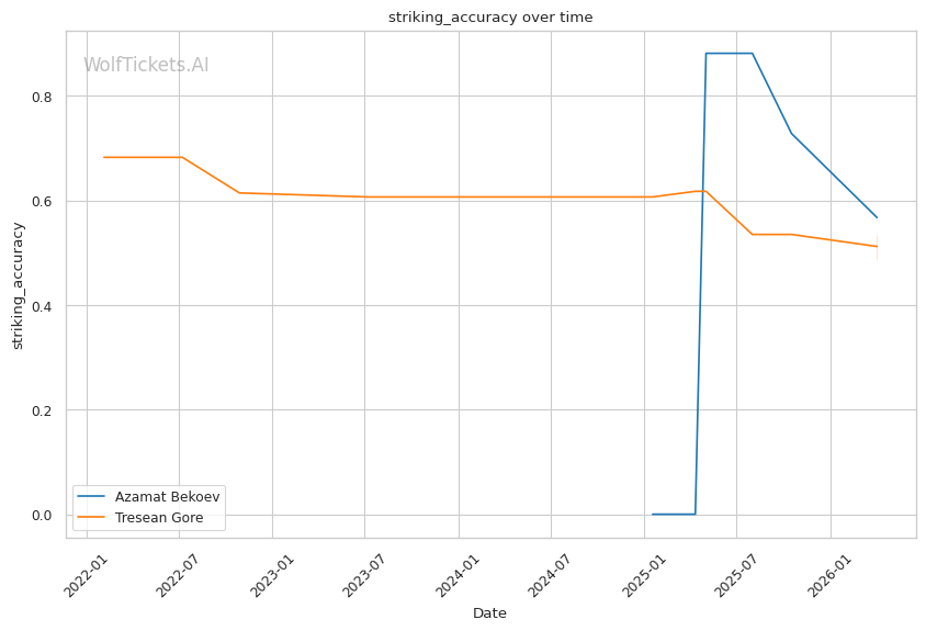 Historical Comparison: This matchup resembles Bekoev vs Belgaroui in some ways. Both Gore and Belgaroui have reach advantages and counter-striking potential. However, Gore lacks Belgaroui's elite kickboxing pedigree and improved takedown defense. Bekoev's wrestling should be more effective here.