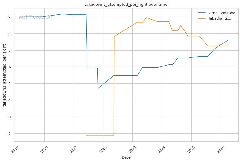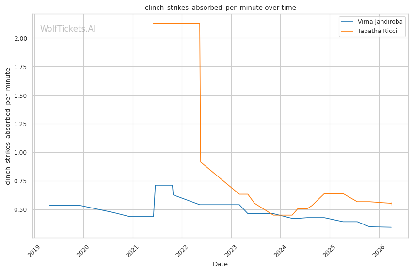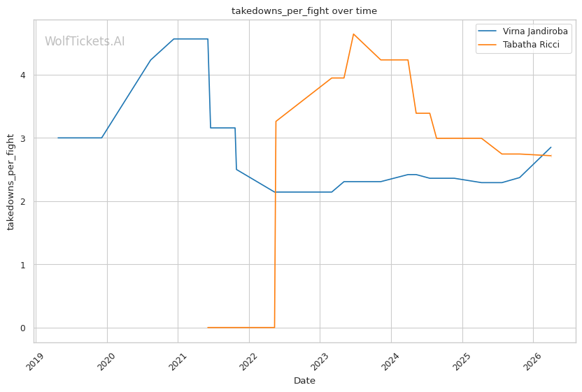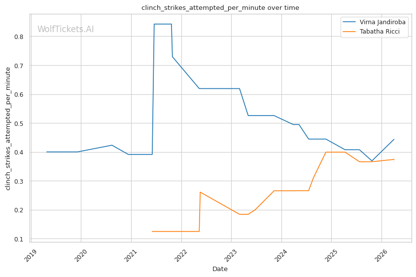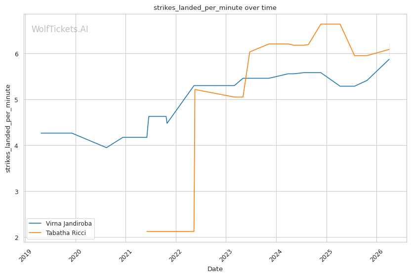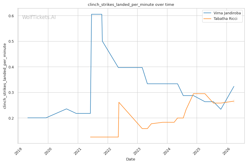 Ricci is a pressure fighter who combines clinch work, volume striking, and grinding grappling. She averages 2.69 takedowns per fight and 6.22 strikes landed per minute, showing she can compete in multiple phases.