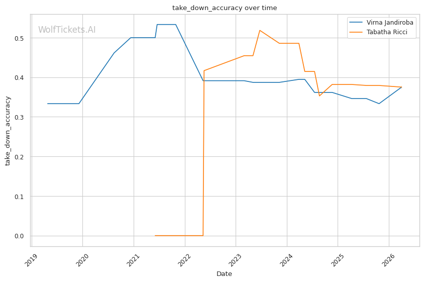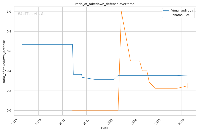 Ricci's 27% takedown defense ratio is a glaring weakness against someone who attempts 7.6 takedowns per fight. Jandiroba's chain wrestling sequences, where she transitions from failed shots into clinch work and eventually secures the takedown, should find success here. Once on the ground, Jandiroba's submission threat is far superior. Ricci averages just 0.12 submissions per fight compared to Jandiroba's 1.52.