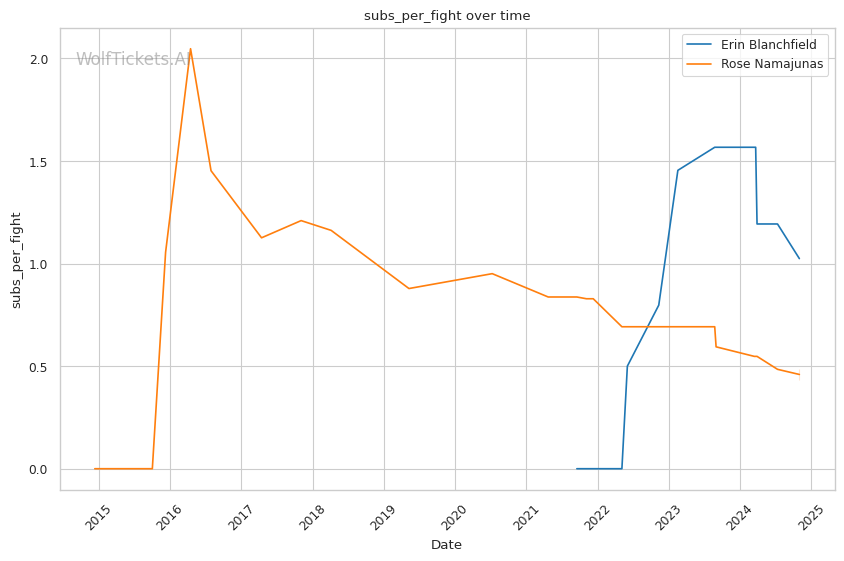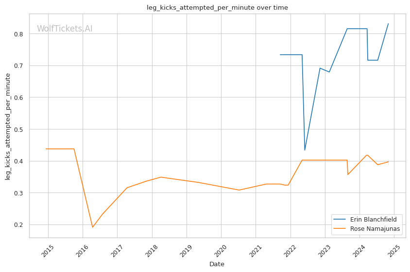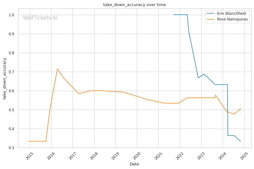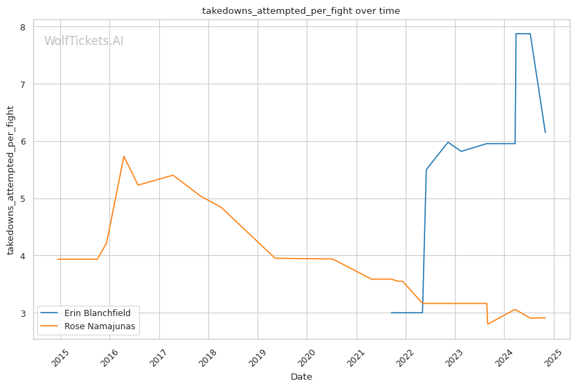 Recent Takedowns Attempted per Fight: Blanchfield's high volume of takedown attempts in recent fights suggests she will likely lean on her wrestling, which could be problematic for Namajunas.