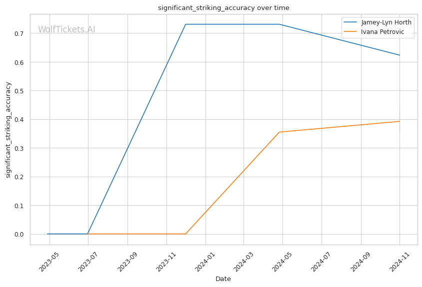 The odds, striking metrics, and recent performance point to Jamey-Lyn Horth having an edge in this matchup. Ivana Petrovic's clearest path is through her grappling, but she'll have to navigate Horth's superior striking to close that distance. With limited prediction history on these fighters, there is some uncertainty. But the data suggests Horth should be favored to get her hand raised.