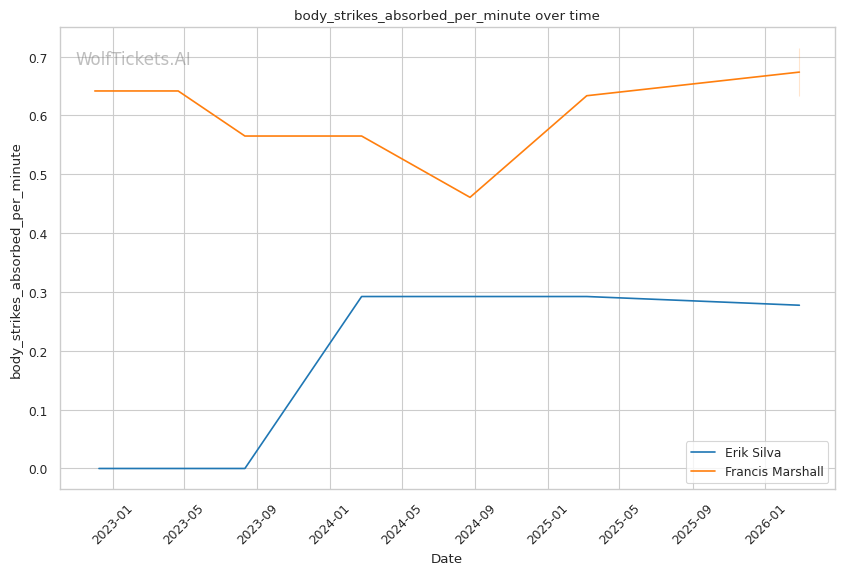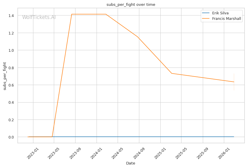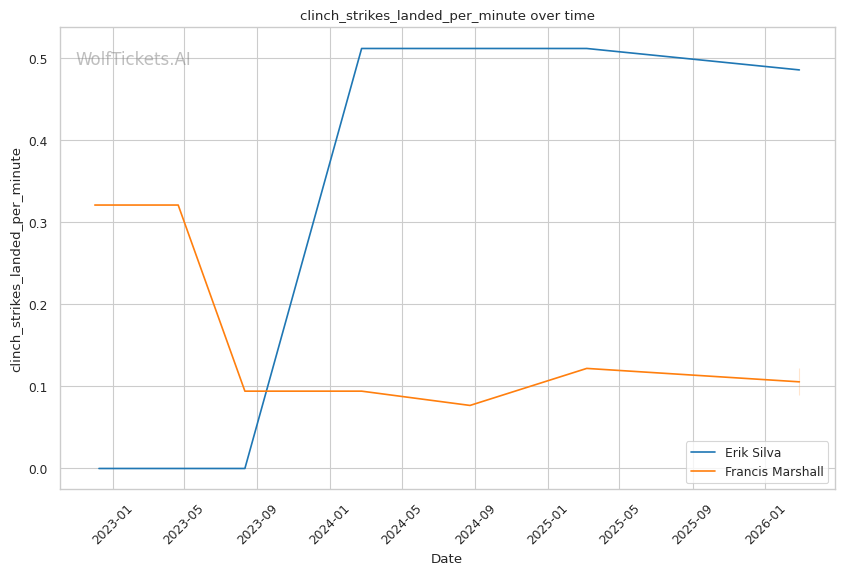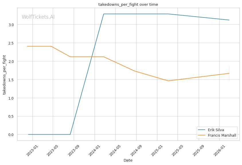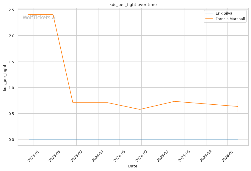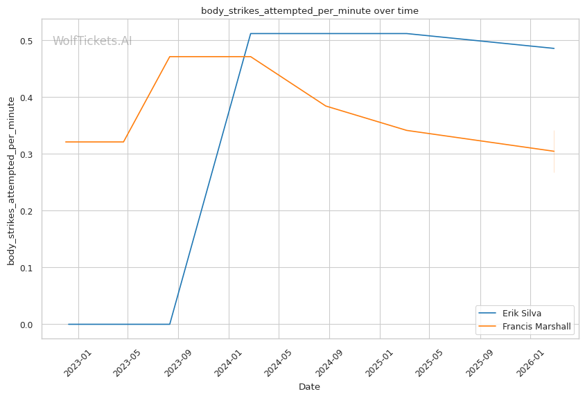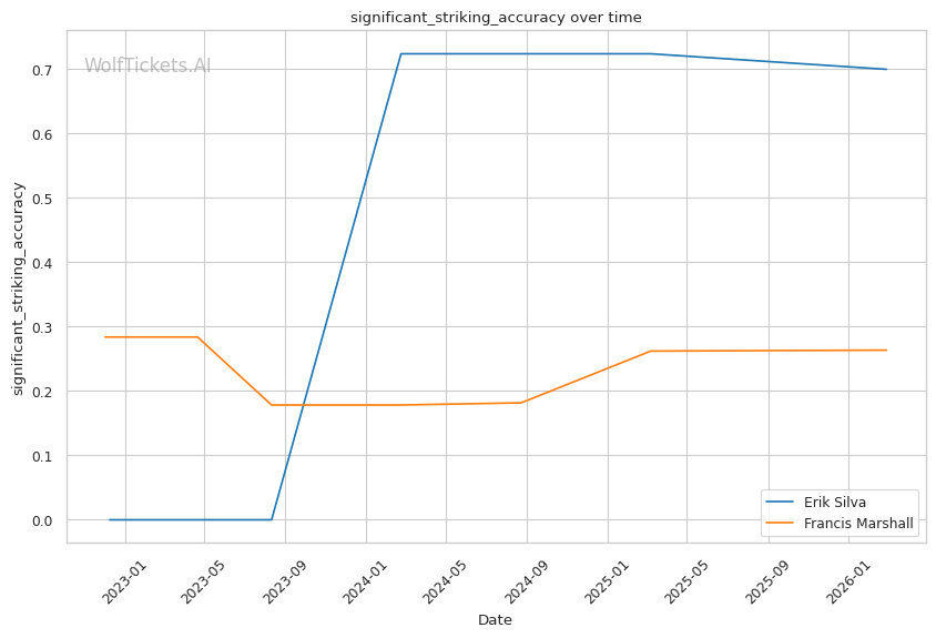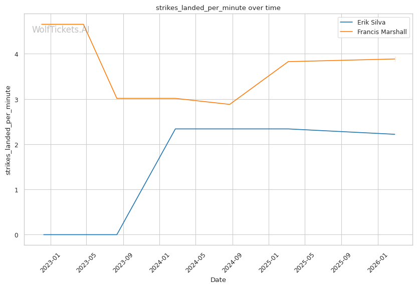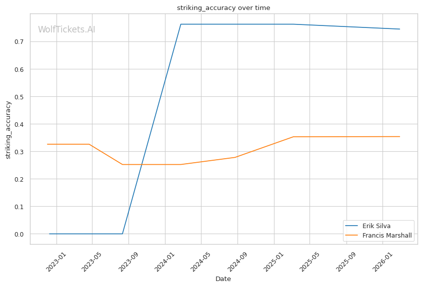 Francis Marshall should handle Erik Silva. Silva's striking defense is too porous to survive against Marshall's counter striking, and his recent KO loss to Naimov suggests durability concerns. While Marshall has shown vulnerability to wrestling, Silva's declining takedown accuracy and overall skill gap make it unlikely he can exploit that weakness consistently. Marshall's technical striking, finishing ability, and higher TrueSkill rating all point to him getting his hand raised. WolfTicketsAI backs Marshall to win.