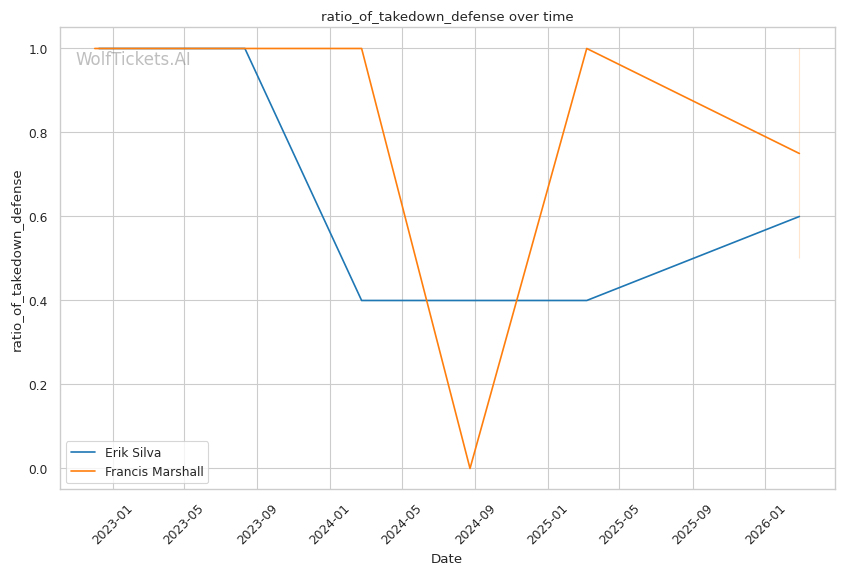 Defensive Wrestling Against the Fence - Isaac Dulgarian exposed this badly in their 2023 fight. Dulgarian bounced Marshall off the fence with a double leg, progressed to three-quarter mount, and finished him with ground and pound in round 1. Silva's wrestling-heavy approach could theoretically exploit this.