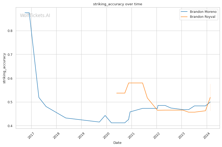 Considering their skills, past performances, and WolfTicketsAI's prediction data, Brandon Moreno is favored to win. His improved striking, defensive tactics, and adaptability give him an edge over Brandon Royval's aggressive, submission-focused style. However, the unpredictability in their past performances and the model's mixed prediction accuracy indicate that the fight could have surprising elements, making it a must-watch for MMA fans.