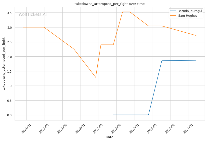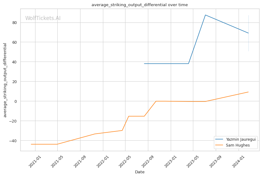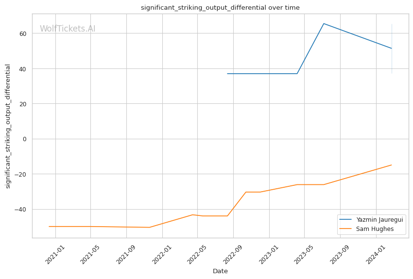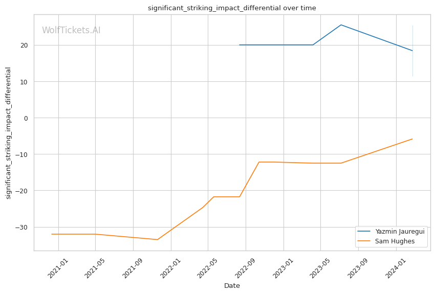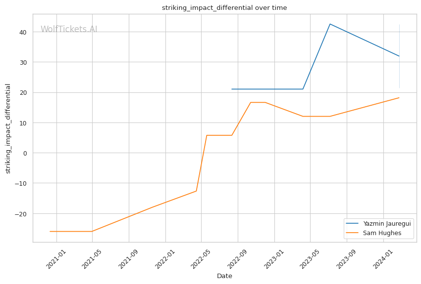 WolfTicketsAI's prediction favoring Jauregui leans heavily on the odds, significant striking impact differential, and recent significant striking impact differential, all favoring Jauregui. However, her TrueSkill is lower compared to Hughes, and recent takedowns attempted per fight slightly disfavor Jauregui, indicating possible vulnerabilities in grappling exchanges.