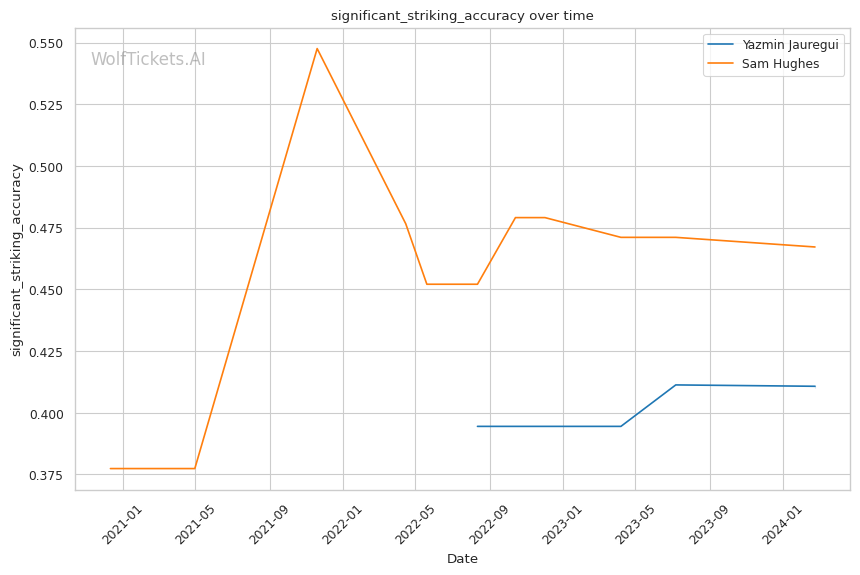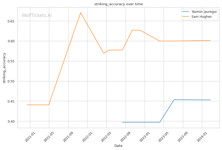 Considering Jauregui's superior striking capabilities and the impact of recent performance metrics, her chances of winning seem strong. However, her recent TKO loss and WolfTicketsAI's mixed prediction accuracy suggest a degree of unpredictability. Hughes' resilience and ability to adapt could make this a closely contested bout. The outcome will likely hinge on Jauregui's striking accuracy and Hughes' ability to counter effectively.