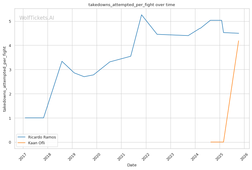Recent Takedowns Attempted per Fight increased the score by 2.0—Ramos's 4.30 attempts per fight directly attack Ofli's worst vulnerability.