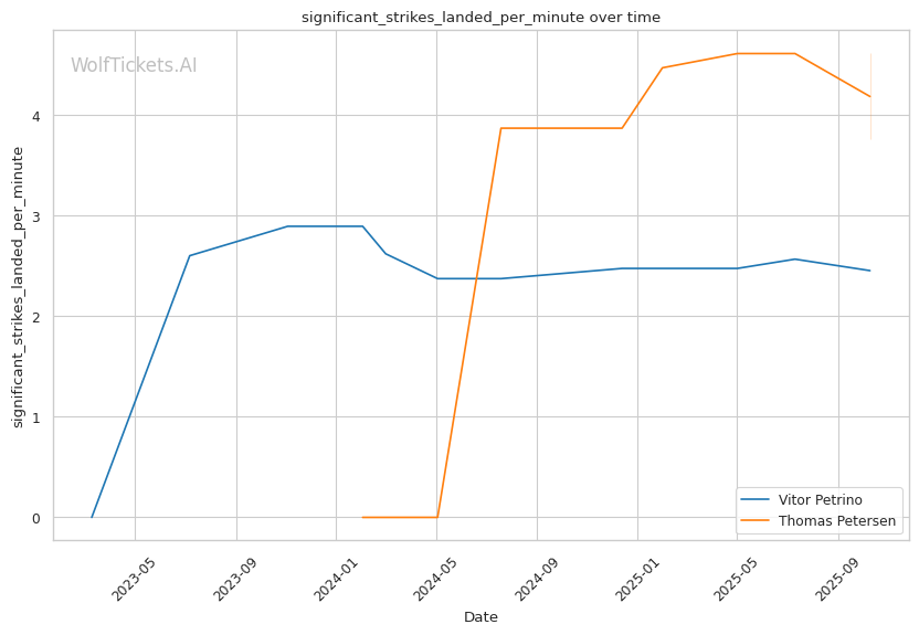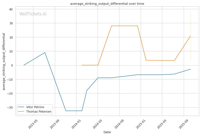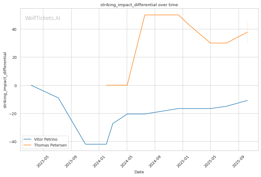Petrino's recent significant striking output differential (+7.3984) and Petersen's negative differential (-26.9722) indicate Petrino lands more meaningful strikes at range. The early striking exchanges favor Petrino's counter-punching and reach advantage.