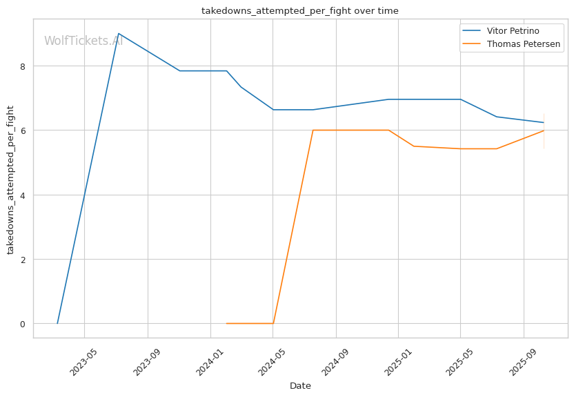 Recent Takedowns Attempted per Fight increased the score by 1.0. Petrino's 6.0128 recent takedown attempts per fight show his willingness to initiate grappling, giving him multiple pathways to victory.