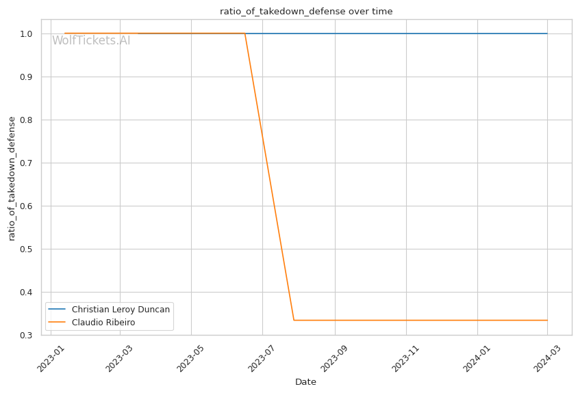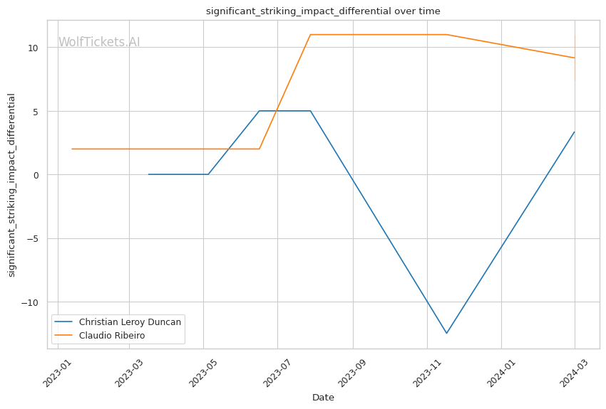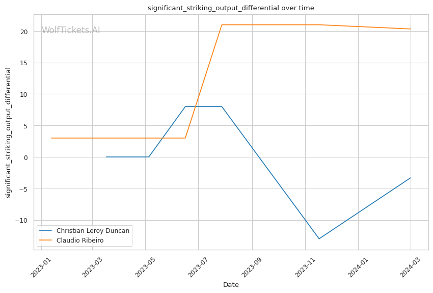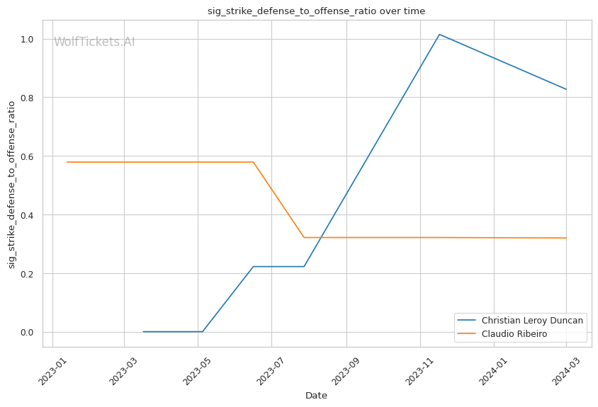 WolfTicketsAI's prediction leans towards Duncan, emphasizing his striking defense, recent win percentage, and reach, all of which play pivotal roles in this prediction. Duncan's striking defense (Striking Defense Percentage: 42.54%) and reach advantage are critical, allowing him to manage distance and land significant strikes while mitigating incoming damage. Ribeiro's recent KO/TKO loss further accentuates concerns about his striking defense against a proficient striker like Duncan.