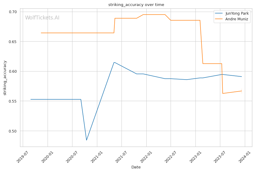 Muniz, on the other hand, has a mixed recent record. He lost two of his last three fights, one by KO/TKO and the other by submission. This raises concerns about his resilience in both stand-up and grappling exchanges. Muniz's significant striking accuracy and output are lower than Park's, which might put him at a disadvantage in a striking battle. However, his submission skills, particularly in earlier fights, should not be underestimated.